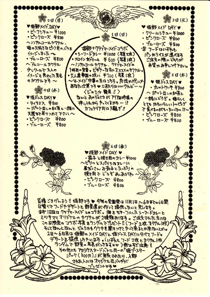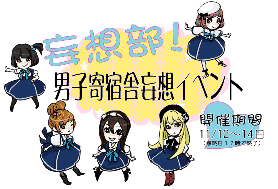 11月1日(日)〜11月8日(日) 姫部 & クラブマーメイド イベント (クリックで大きな画像が出ます。) 1日(日) クラブマーメイドと姫部コラボDay (ジェシカ襲来???) 2日(月) メイドDAY 3日(火) メイドDAY 4日(水) 姫ドレスDAY 5日(木) 姫ドレスDAY 6日(金) メイドDAY 7日(土) クラブマーメイド・イベント 8日(日) クラブマーメイド・イベント 11月12日(木)〜11月14日(土) 妄想部イベント: 男子寄宿舎妄想イベント!!!