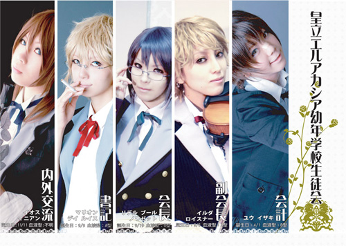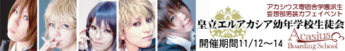 皇立エルアカシア幼年学校とは、優秀な男子生徒が揃う男子寄宿舎学校。 その生徒会といえば個性豊かでかっこいい生徒達が集う組織としてアカシウスにも常々奄ェささやかれていました。 もちろん 妄想部を中心に大騒ぎしてましただぜ!!! 0>w<0 そんな生徒会メンバーがついにアカシウスに訪れてしまうとなったら大変です・・・!!!!! きたる文化祭今年の妄想題材はその生徒会メンバー!!! 本物が現れてしまったらいったいどうなってしまうのでしょうか・・・!! 全力で妄想しましょう!!!! 男子寄宿舎妄想イベント!! ☆開催期間:11月12日(木)〜11月14日(土)☆ 最終日はオープン〜17時までになりますのでご注意下さい。 ☆参加型企画☆ 妄想部にきたからには是非あなたの妄想きかせてください! 目の前にいる生徒会のメンバーであんなことやこんなこと。 参加賞として、妄想部特性シールをプレゼント。 また抽選で生徒会メンバーのラブレター付きミニフォトブックを5名様にプレゼント! ☆限定メニュー各種ご用意☆ すべてのメニューに妄想部が独自ルートで入手した生徒会メンバーと妄想部員の写真をお付けします!! ●「愛情たっぷり野菜たっぷりミネストローネ」スーププレート! 900円 妄想部員が愛と欲望と妄想を込めた手作りスープ。 おいしいパンがセットになってます。 限定10食 ●「日替わり妄想部定番デザート」 600円 毎日違うデザートをご提供。 その日しか食べられない味を堪狽オてください! 限定10食 12日 特性とろとろぷりん 13日 ヨーグルトムース 14日 アカシアンティゼリー ●生徒会オリジナルカクテル! 600円 エルアカシア幼年学校の生徒会をイメージしたオリジナルドリンクをなんと5種類ご用意しました! ノンアルコールカクテル 3種。 アルコールカクテル 2種。 皆の夢を壊す、皆の夢を作るは吾等妄想部の使命だぞ!!!!! 皆様のご来訪心よりお待ちしております☆ 是非遊びに来てね〜>///< ではでは、いい妄想を〜〜〜〜〜〜!!wwwwwwwwwww 部長 イオン・ノラ・アンスエル 部長補佐 イルマ・ラプンツェル・レトランジュ リオル・フェイ・エコレッタ ユン・ド・ジュールブラン マリリア・エル・アーデランデ このイベントに合わせて、新たな皇立エルアカシア幼年学校生徒会日誌が出来る本格的!!!