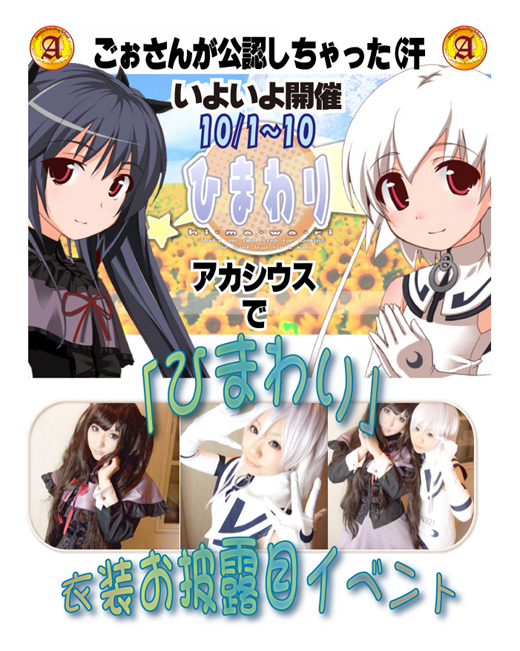 10月1日(木)〜10月10日(土) 『アカシウスで”ひまわり”衣装お披露目』イベント 同人ゲーム『ひまわり』とのタイアップイベント ぶらんくのーと様より初の公認カフェイベントになります。 詳細はこちら 10月11日(日)〜10月31日(土) 収穫祭イベント 収穫祭といえば、秋の収穫に感謝するお祭り! 採れたの美味しいお野菜とお肉を始めとした作物に感謝すべく いろいろな食べ物を週代わりでご提供させて頂きます。 今年のテーマは、繊細にして大胆です! どれも1週間だけのメニューなので、食べ損ねないように、チェックしてくださいね! 収穫祭イベント限定アルコール: 収穫祭イベント限定アルコールは、10月11日(日)〜10月31日(土)の期間提供!!!