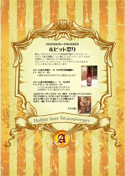 が発売して1周年!!! そこで1周年を記念し、ホビットビール、ホビットシェーク2つのドリンクにちなんだ イベントを行いたいと考えています。 実は、5月2日で、アカシウス寄宿舎学園オリジナルビール 『ホビット族の爽麗ビール』(略して、ホビットビール)が発売して1周年! そこで1周年を記念し、ホビットビール、ホビットシェーク2つのドリンクにちなんだ イベントを行いたいと思います! ホビット族の爽麗ビール 500円(特別価格) 200円引き (ゴールド ビール) ※通常700円が500円でのご提供になります ホビット族の疲労回復シェーク 600円 (ノンアルコール・ミルルセーキ) ※こちらは生徒が必死に作りますが…、お時間をいただく場合がございます。 上記のドリンクをご注文につき、1枚カードを引いていただきます。 当たりが出たら、入口にいるアルボ君とチェキ! はずれ5枚でホビット君とチェキが撮れます! 生徒も一緒に入れてあげてくださいね! 入口のホビット族のアルボ君