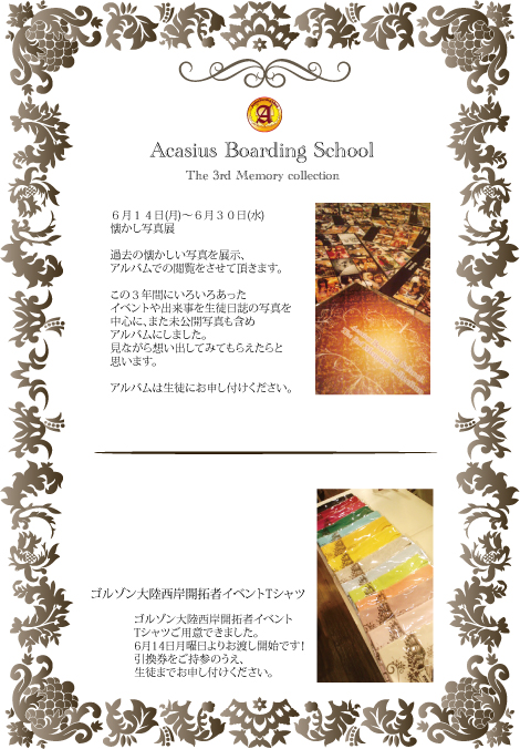 6月14日(月)〜6月30日(水)The 3rd Memory collection 懐かし写真展 過去の懐かしい写真を展示、 アルバムでの閲覧をさせて頂きます。 この3年間にいろいろあった イベントや出来事を生徒日誌の写真を 中心に、また未公開写真も含め アルバムにしました。 見ながら想い出してみてもらえたらと 思います。 アルバムは生徒にお申し付けください。