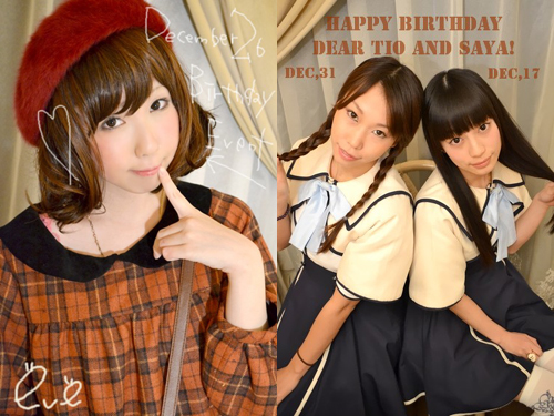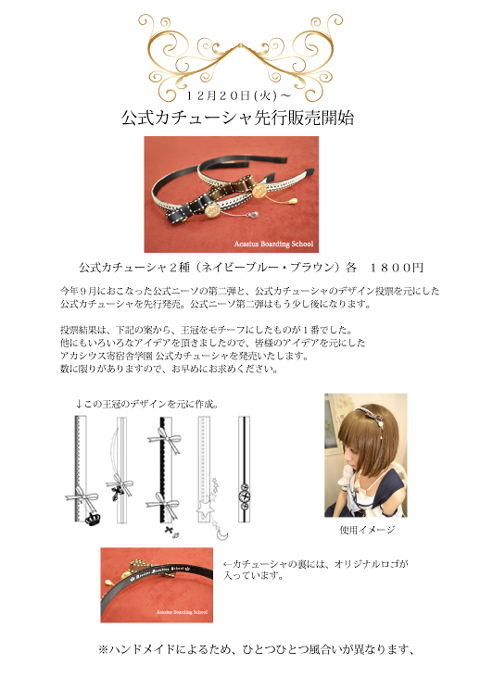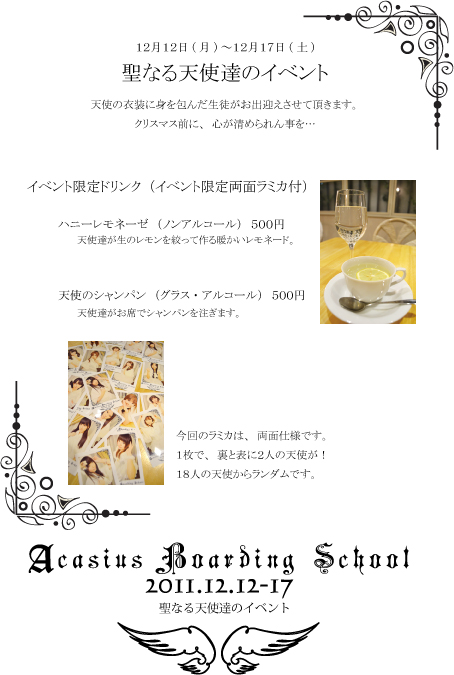 12月1日(木) ウキュラ・バースディ ごきげんよう!青い鳥のウキュラです! アカシウス寄宿舎学園へ入学してから2年5ヶ月が過ぎました。 この場所で沢山の人に出会い、沢山の経験をしてウキュラは少しずつですが成長することが出来ました。 そんな私も今週の12月1日で4才になります! また今年もアカシウスのカフェテリアをウキュラシアの森に変えて、ささやかな誕生日パーティーをします♪ 日頃の感謝の気持ちを込めて、幸せの青い鳥としてみなさんに幸せを運べたら嬉しいです! ではでは当日カフェテリアでお会い出来ること楽しみにしています♪ 12月2日(金)〜12月9日(金) <12月4日をのぞく> 年賀状をお渡ししたいイベント! 期間中にお申し込み頂けると、アカシウス寄宿舎学園より年賀状を受け取るイベント 受け取り方は 自宅に受領したい方は自宅へ郵送 来店して受け取りたい方は来店して1月1日以降に受け取り もちろん郵送でも無料です せっかくの機会ですので、来店されて申し込まれてみてはいかがでしょうか? 12月4日(日) アリア・シノグ バースディ 詳細は後日Blogにて 12月10日(土)、12月11日(日) ミツキ・アオ バースディ & アオ卒業イベント 詳細は後日Blogにて 12月12日(月) 特得チケット発売開始 昨年から年末と6月に販売している特得チケット 今年末も、12月12(月)〜1月3日(火)までの期間販売致します。 1回分お得な回数券、チェキ券付き、ポイント2倍 と3拍子揃ったチケットです。 『アカシウス寄宿舎学園 特得チケット』とは、 1時間滞在料金10回分の価格で −1枚分お得になり11回(11時間分)使え −さらにチェキ券が1枚付いてきて −購入時にポイントが2倍 なる大変お得なチケット 2つほど制限が付いてます。 -1日1枚のみ使用可能 -有効期限:2012年12月31日まで 有効期限は、あまり関係ないかもしれませんが一応1年間 何度か来られる予定があるなら買っておいて損は無いチケット 買ったその日にも使えるでの、何度か来訪予定ならぜったい買いです! 発売期間は、1月3日までか、売り切れるまでとなります。 12月12日(月)〜12月17日(土) 聖なる天使達のイベント 聖なる天使達のイベント 天使の衣装に身を包んだ生徒がお出迎えさせて頂きます。 クリスマス前に、心が清められん事を… イベント限定ドリンク(イベント限定両面ラミカ付) ハニーレモネーゼ (ノンアルコール) 500円 天使達が生のレモンを絞って作る暖かいレモネード。 天使のシャンパン (グラス・アルコール) 500円 天使達がお席でシャンパンを注ぎます。 今回のラミカは、両面仕様です。 1枚で、裏と表に2人の天使が! 18人の天使からランダムです。 天使のイベント衣装は、生徒たちにも好評で、 2年ぶりに復活して開催となりました。 6日間のみと少し短い期間ですが、是非、見てもらえたらと思います! 12月18日(日) ナルル・セイル最終日 12月19日(月)〜12月25日(日) サンタガールのハンドベル 復活のハンドベル演奏。 去年はお休みしましたが、今年はやっぱり復活しちゃいました! ハンドベル演奏のこの期間、生徒はサンタ衣装でお迎えさせて頂きます。 12月20日(火) 公式カチューシャ先行販売開始 公式カチューシャ2種(ネイビーブルー・ブラウン)各 1800円 今年9月におこなった公式ニーソの第二弾と、公式カチューシャのデザイン投票を元にした 公式カチューシャを先行発売。公式ニーソ第二弾はもう少し後になります。 投票結果は、下記の案から、王冠をモチーフにしたものが1番でした。 他にもいろいろなアイデアを頂きましたので、皆様のアイデアを元にした アカシウス寄宿舎学園 公式カチューシャを発売いたします。 数に限りがありますので、お早めにお求めください。 一番左の王冠のデザインを元に作成しました。 使用イメージです。 カチューシャの裏には、オリジナルロゴが入っています。 ※ハンドメイドによるため、ひとつひとつ風合いが異なります。 アカシウスの制服を来た生徒がカチューシャをつけているので、 是非、見てみてくださいね! 12月26日(月) イブ バースディ&新入生プチバースディ イベント 皆様、ごきげんよう!さむがり画伯でございますよ。 リーフェンベルクは随分寒くなりましたね…!カフェテリア内もサンタさんがいっぱいいて、お願い事をしてる生徒もちらほら…素敵なクリスマスムード一色ですが、旅の方々も浮かれてお風邪をひかないようにしてくださいませ! そんなクリスマスの後にもうひとつ!バースディイベントのお知らせでございます! 12月26日はイヴの誕生日なのです…!イヴのくせにクリスマスの次ですみません(笑) なんと11月に入学したティオちゃん彩ちゃんも12月がお誕生日♪ イヴのお誕生日、そして可愛い新入生2人のお誕生日と新入生お披露目も兼ねて3人でバースディイベントをさせて頂く運びとなりました(・▽・)! 画伯は気合いを入れてケーキを作ろうと目論んでおりますよぐふふ…! まだまだ未熟なクォーツ3人ですが、ちょっぴり成長した姿を見にきて頂けたら幸せです…☆ 当日のメニューなどはまた