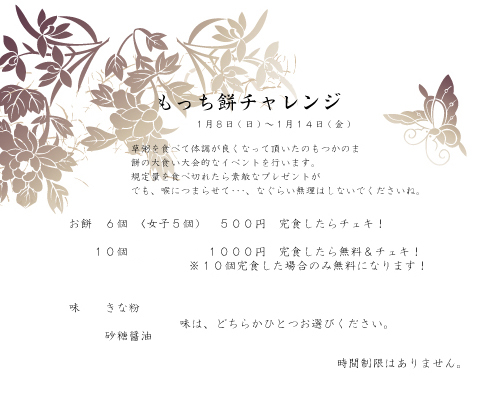 1月1日(土) 年賀状お渡し(受付された方) 12月2日(木)〜12月9日(木)の年賀状をお渡ししたいイベント! で登録頂いた方で、お店での受け取りを希望された方への年賀状お渡し開始 1月1日(土)〜1月3日(月) 巫女服でお出迎え 緋の諸島のお正月の風物詩である初詣気分を味わって頂きたく エルファイの丘を登り…女神にお祈りしてきた後は、 アカシウスで、お神酒を飲みながら、巫女達の姿を見、おみくじを楽しんでください。 イベント内容: ●アカシウスの生徒達が巫女服でお出迎えします。 ●ご来訪の皆様へ、お神酒を振舞わせて頂きます。(お神酒なので無料です) ●アカシウス寄宿舎学園 おみくじ を用意します。 営業時間 1月1日(土) 16:00〜22:30 巫女服イベント 1月2日(日) 11:00〜22:30 巫女服イベント 1月3日(月) 11:00〜22:30 巫女服イベント 1月4日(火)〜1月6日(木) 休業日(お休み) 1月7日(金)〜1月8日(土) 草粥を食べよう 七草粥…程は出来ませんが 春菊、小松菜、糸みつ葉、カブ、大根、生姜、干海老など と、野菜がたくさん入ったお粥を提供したいと思います。 年末年始、暴飲暴食で疲れた胃をお休みさせてあげてください。 1月8日(日)〜1月14日(金) もっち餅チャレンジ 草粥を食べて体調が良くなって頂いたのもつかのま 餅の大食い大会的なイベントを行います。 規定量を食べ切れたら素敵なプレゼントが でも、喉につまらせて・・・、なぐらい無理はしないでくださいね。 お餅を6個〈女子5個) 500円 完食したらチェキ! お餅を10個 完食したら無料&チェキ!<<完食出来なければ1000円>> ※10個完食した場合のみお餅が無料になります! 味 きな粉 or 砂糖醤油 味は、どちらかひとつお選びください。 時間制限はありません。 1月15日(土) アスティ・凛 バースディ アスティと凛の合同バースディイベント。 詳細は後日Blogで 1月16日(日)〜1月23日(日) 手作りカルタ・プレゼントイベント 生徒達の手作りカルタが1枚もらえるイベント 生徒によって、いろんなタイプのカルタが出来ちゃいますので、 是非、コンプしてみてください。 ★1来訪につき1枚ランダムでカルタプレゼント ★イベントドリンクを頼まれると指定カードを1枚プレゼント ●イベントドリンク● 16日(日)〜19日(水) : 甘酒 or ショウガ湯 20日(木)〜23日(日) : おしるこ(時間により餅入り) or ショウガ湯 1月20日(木) 2月のカレンダー販売 過去のカレンダーサンプル