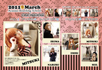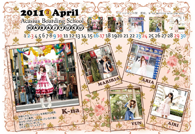 3月18日(金) 職業対抗イベント優勝組クローズパーティ 1月に行われた職業対抗イベントの優勝組の方々のみをお迎えする クローズパーティ 3月21日(月) 4月のカレンダー販売 4月カレンダーは、原宿へ。 テーマは多様化するファッション。 だったので、選抜メンバーは、自分なりのファッション観をもった生徒達を集めての撮影。 今回は、なんだかとってもストリートスナップらしい写真があがってきて嬉しかったです。 マリリア、ユンは、 こんな女の子と一緒に歩きたい! という理想像な感じ。 ケーナ、アリア、アイリは 一緒に歩くのは…。 でも、インパクトや見栄えは豪華で、 すごいと尊敬せざるをえません。 今回も、撮影中声をかけてもらったりと、 とても撮影しごたえあったようですが、 モデルと衣装、場所すべての相性がうまく いっているのではないかと思います。 デザインは、可愛い春をイメージしました。 今年も、もちろん、来月のカレンダー発売まで、 写真が付いてきます! 1部500円(ランダム写真付・ケース希望の場合はお申し付けください) 2月〜12月まで購入でプレゼントをお渡しの予定ですので、 是非、集めてみてください。 モデル ケーナ、マリリア、アリア、ユン、アイリ 特典写真は5枚の写真から1枚(ランダム)お渡しです。 昨年から始めた毎月のカレンダー。今年のテーマは街 季節に合わせて、いろんな街へ出かけた写真です。 日頃見れない生徒の様子が垣間見れるかも 過去のカレンダーサンプル(2010年)