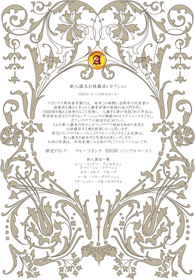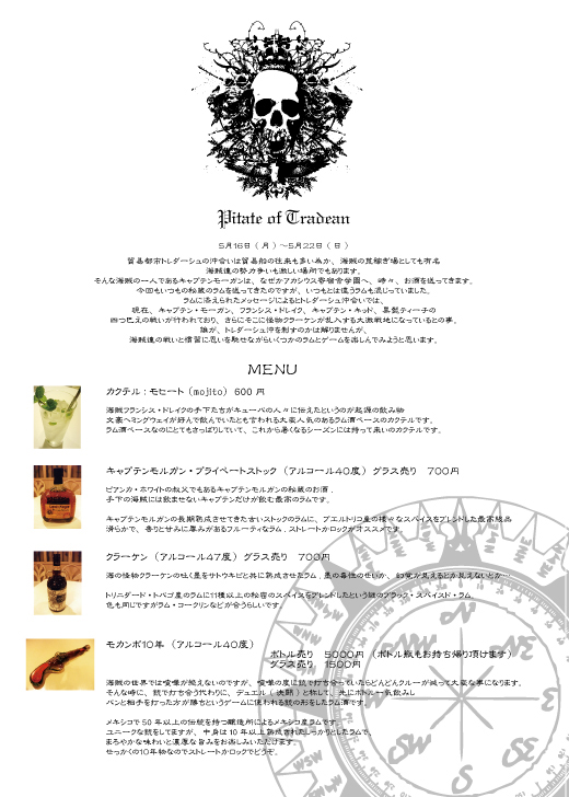 5月1日(日)〜5月7日(土) お弁当作ってみたんですけど…イベント あの、お弁当作ってみたんですけど、良かったら食べてみて貰えませんか? といったお約束が春になると、あるとか無いとか アカシウス寄宿舎学園の生徒もそんな気分を味わってみたくお弁当を作ってみる事に お弁当箱は、可愛いイチゴのお弁当箱 おかずの内容は、その日ほぼ同じですが、 盛り付け、飾りつけは、生徒によりセンスが出る所かも 上のサンプルよりは、良いものが出来ると思うのだけど、乞うご期待 ※このイベント開催中は、竜騎士見習いの満腹ボウルは中止致します。 5月8日(日)〜5月15日(日) 新入園生お披露目レセプション アカシウス寄宿舎学園では、毎年この時期に各都市の代表者の 推薦状を携えた多くの入園希望者が面接の為の門を叩く。 1000倍を超える倍率をみごと突破し、入園する事が承認された学生は、 寄宿舎生活などのオリエンテーションなど凝縮されたスケジュールをこなし、 カフェテリアでの給仕をはじめていく。 そんな新入園生の中からカフェテリアで給仕を始めた生徒を お披露目する場を提供したいと思います。 限定ドリンクのフルーツたっぷりフルーツポンチをご注文頂くと、 新入園生を紹介する写真をお渡しいたします。 今回の写真は、生徒名簿に入る前のプレミアムなバージョンです。 限定ドリンク: フルーツポンチ 500円(ノンアルコール) 新入園生一覧 レノン・ラミアー・アンセルジュ ユーイ・シン・ドラーシュ ユウ・メルク・フルーア コハル・ソラ・ダリアーシュ イヴ・シェリー・クルールヴァリエ 写真は、レノンと、ユーイ。 もちろん彼女たちもまだまだ、新入園生なので、 是非、温かく見守っていただけたらと思います。 5月16日(月)〜5月22日(日) パイレーツ オブ トレーディアン 貿易都市トレダーシュの沖合いは貿易船の往来も多い為か、海賊の荒稼ぎ場としても有名 海賊達の勢力争いも激しい場所でもあります。 そんな海賊の一人であるキャプテンモーガンは、なぜかアカシウス寄宿舎学園へ、時々、お酒を送ってきます。 今回もいつもの秘蔵のラムを送ってきたのですが、いつもとは違うラムも混じっていました。 ラムに添えられたメッセージによるとトレダーシュ沖合いでは、 現在、キャプテン・モーガン、フランシス・ドレイク、キャプテン・キッド、黒髭ティーチの 四つ巴えの戦いが行われており、さらにそこに怪物クラーケンが乱入する大激戦地になっているとの事。 誰が、トレダーシュ沖を制すのかは解りませんが、 海賊達の戦いと慣習に思いを馳せながらいくつかのラムとゲームを楽しんでみようと思います。 イベント限定ドリンク (ラム酒フェア) カクテル:モヒート(mojito) 600円 海賊フランシス・ドレイクの手下たちがキューバの人々に伝えたというのが起源の飲み物 文豪ヘミングウェイが好んで飲んでいたとも言われる大変人気のあるラム酒ベースのカクテルです。 ラム酒ベースなのにとてもさっぱりしていて、これから暑くなるシーズンには持って来いのカクテルです。 キャプテンモルガン・プライベートストック(アルコール40度) グラス売り 700円 ビアンカ・ホワイトの叔父でもあるキャプテンモルガンの秘蔵のお酒 手下の海賊には飲ませないキャプテンだけが飲む最高のラムです。 キャプテンモルガンの長期熟成させてきた古いストックのラムに、 プエルトリコ産の様々なスパイスをブレンドした最高級品 滑らかで、香りと甘みに厚みがあるフルーティなラム ストレートかロックがオススメです。 クラーケン(アルコール47度) グラス売り 700円 海の怪物クラーケンの吐く墨をサトウキビと共に熟成させたラム 墨の毒性のせいか、幻覚が見えるとか見えないとか… トリニダード・トバゴ産のラムに11種以上の秘密のスパイスをブレンドしたという謎のブラック・スパイスド・ラム。 色も同じですがラム・コークリンなどが合うらしいです。 モカンボ10年(アルコール40度) ボトル売り 5000円 (ボトル瓶もお持ち帰り頂けます) グラス売り 1500円 海賊の世界では喧嘩が絶えないのですが、喧嘩の度に銃で打ち合っていたら どんどんクルーが減って大変な事になります。 そんな時に、銃で打ち合う代わりに、デュエル(決闘)と称して、先にボトル一気飲みしてバンと相手を打った方が勝ちというゲームに使われる銃の形をしたラム酒です。 メキシコで50年以上の伝統を持つ醸造所によるメキシコ産ラムです。 ユニークな銃をしてますが、中身は10年以上熟成されたしっかりとしたラムで、まろやかな味わいと濃厚な旨みをお楽しみいただけます。 せっかくの10年物なのでストレートかロックでどうぞ。 5月20日(金) 6月のカレンダー販売 昨年から始めた毎月のカレンダー。今年のテーマは街 季節に合わせて、いろんな街へ出かけた写真です。 日頃見れない生徒の様子が垣間見れるかも 6月カレンダーは、秋葉原へ。 テーマは4周年を記念して、 制服でお出かけしようと秋葉原に! 朝早い時
