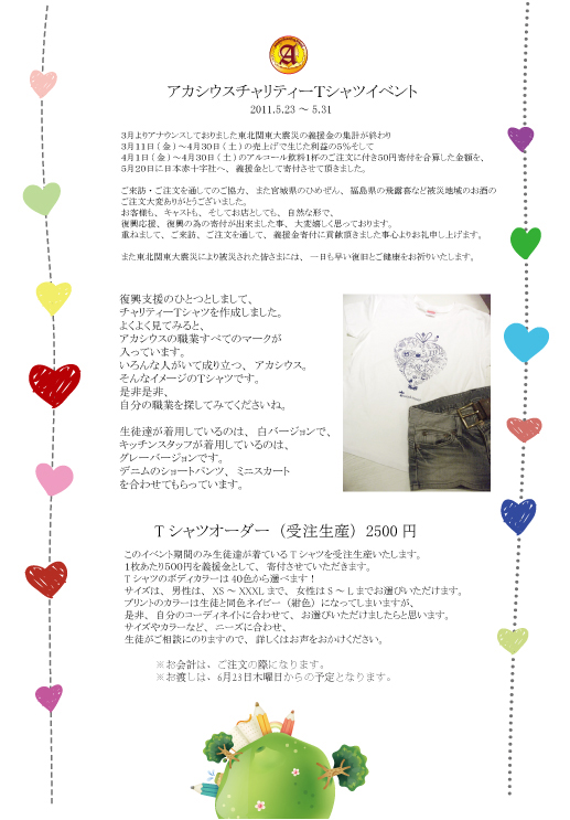 5月23日(月)〜5月31日(火) アカシウスチャリティーTシャツイベント 3月よりアナウンスしておりました東北関東大震災の義援金の集計が終わり 3月11日(金)〜4月30日(土)の売上げで生じた利益の5%そして 4月1日(金)〜4月30日(土)のアルコール飲料1杯のご注文に付き50円寄付 を合算した金額を、 5月20日に日本赤十字社へ、義援金として寄付させて頂きました。 ご来訪・ご注文を通してのご協力、 また宮城県のひめぜん、福島県の飛露喜など 被災地域のお酒のご注文大変ありがとうございました。 お客様も、キャストも、そしてお店としても、自然な形で、 復興応援、復興の為の寄付が出来ました事、大変嬉しく思っております。 重ねまして、ご来訪、ご注文を通して、義援金寄付に貢献頂きました事 心よりお礼申し上げます。 また東北関東大震災により被災された皆さまには、 一日も早い復旧とご健康をお祈りいたします。 復興支援のひとつとしまして、 チャリティーTシャツを作成しました。 よくよく見てみると、 アカシウスの職業すべてのマークが入っています。 いろんな人がいて成り立つ、アカシウス。 そんなイメージのTシャツです。 是非是非、自分の職業を探してみてくださいね。 生徒達が着用しているのは、白バージョンで、 キッチンスタッフが着用しているのは、 グレーバージョンです。 デニムのショートパンツ、ミニスカート を合わせてもらっています。 Tシャツオーダー(受注生産)2500円 このイベント期間のみ生徒達が着ているTシャツを受注生産いたします。 1枚あたり500円を義援金として、寄付させていただきます。 Tシャツのボディカラーは40色から選べます! サイズは、男性は、XS〜XXXLまで、女性はS〜Lまでお選びいただけます。 プリントのカラーは生徒と同色ネイビー(紺色)になってしまいますが、 是非、自分のコーディネイトに合わせて、お選びいただけましたらと思います。 サイズやカラーなど、ニーズに合わせ、 生徒がご相談にのりますので、詳しくはお声をおかけください。 ※お会計は、ご注文の際になります。 ※お渡しは、6月23日木曜日からの予定となります。 焼き菓子の日: (毎週土曜、祝日) 毎週土曜日と祝日は、『焼き菓子の日』! 時間は未定(12時前後)なので、 学級日誌BLOGをチェックして、焼きたてを食べに来てくださいね。 アカシウス焼きたてベーカリーの日: (毎週日曜日) 焼き菓子の日だけでは飽きる…との事で始めた石鹸プレゼントでしたが やはりカフェなので、食べ物の方が良い・・・ との事で、日曜日は、『アカシウス焼きたてベーカリーの日』に 日曜日の朝に焼きたてのパンをご提供 有料ですが、とっても美味しいので、是非、召し上がってみてください。 それぞれのイベント毎の詳細は、こちらのWeb、もしくは学級日誌Blogで告知をしていきますので、ご期待ください。