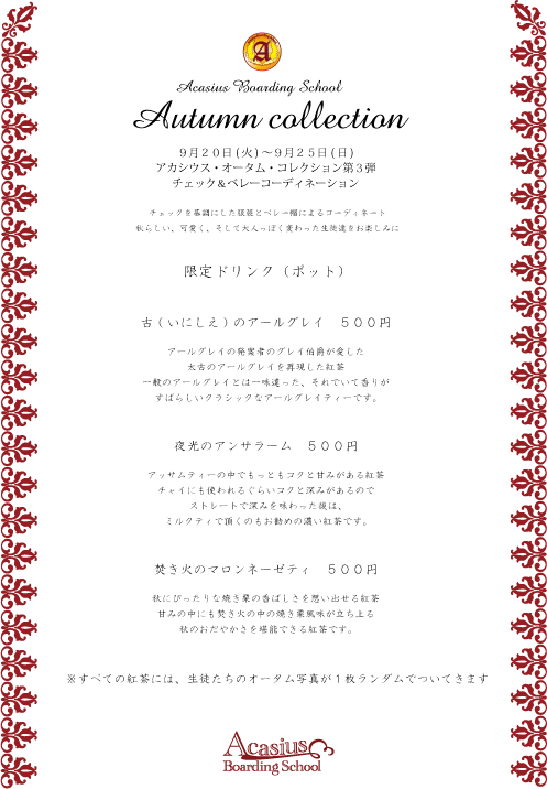 9月5日(月) 休業日 9月5日の月曜日は、お休みさせて頂きます。 お知りおきください。 9月6日(火)〜9月11日(日) アカシウス・オータム・コレクション第一弾 『イザラード王国の故宮を偲んで』イベント カリメーヌ大陸北東に位置し、大陸内ではもっとも古い歴史を持ち、その歴史の長さ から文化・芸術が盛んなイザラード王国。 歴史の授業でそのイザラード王国のかつての文化に触れた生徒達の間で、 かつてのイザラード故国で流行したという脚線美を強調するスカートに深いスリット の入ったドレスがちょっとしたブームに! 竜王戦争前にはカリメーヌ大陸の覇者でもあった王国の故宮を偲び、イザラード故国 の当時の衣装とスイーツやお茶などを提供するイベントを開催するはこびとなりまし た。 いつもとかなり違う生徒のドレス姿に胸を、ときめかせてみませんか? 今年のイザラードの衣装は、 赤や青の艶やかなものを加えてみました。 本格的な衣装を、お楽しみいただけましたらと思います。 9月6日火曜日〜9月9日金曜日(平日限定のお食事) 自家製本格的回鍋肉 800円 9月10日土曜日・9月11日日曜日(土日限定のお食事) 自家製食的辣油五目炒飯 800円 イザラードのお茶のサービス 9月6日(月)〜9月11日(日) 鉄観音や茉莉花茶など日替わりで、 1杯無料でご用意させていただきます。 9月12日(月)〜9月19日(月 祝日) アカシウス・オータム・コレクション第2弾 公式ニーソ セカンドデザインとカチューシャのデザイン投票会 クチュリエ:ジャン=ジルベールによる公式ニーソのファーストバージョンが 作られてからずいぶんと立ちました。 この度、公式ニーソの第二弾と、公式カチューシャのデザイン投票を 旅のお方にもご参加頂き、行っていきたいと思います。 前回も投票だけでなく、頂いた意見を元に改良させて頂いた事も多かったので 投票と共に、ご意見も頂けたらと思います。 女性の方、是非ご協力お願いしたいと思います。また、男性にも喜んでいただけるようなものにしたいと思っておりますので、ご協力いただけたら幸いです。 お好きなデザインをお一つお選びいただき、 ご提案やご意見などございましたら、是非、空欄を作っておりますのでご利用いただけましたらと思います。 ニーソックス編 カチューシャ編(上から見た図になります) ソックスは、2回目なこともあって、たくさんのアイデアが浮かんできましたが、 カチューシャははじめてのことで、生徒みんなで考えてみましたが、 なかなかデザインが難しく、悩んでいます。 色や素材など含めてご意見いただけましたらと思います。 ニーソ&カチューシャ投票途中経過につきまして 公式ニーソとカチューシャの投票に ご参加いただきありがとうございます。 今回は、投票のデザインがかなり 分散してどのデザインになるかまだまだ、 わかりません。 皆様から頂いた投票や空欄に頂いたアイデアを元に 最終的には、生徒達と、煮詰めていきたいと思っています。 また空欄に大変参考となるようなアイデアを頂いた方には、 製品が出来た際、完成品をプレゼントさせて頂きたいと思っています。 本日まで記名欄がございまいせんでしたので、 既にアイデアを出された方は、後日でも結構ですので、 これは自分が出したと名乗り出て頂けたらと思います。 さらに17日土曜日と19日月曜日に 投票してくださった方には、 ニーソックス&カチューシャの割引券を お渡しさせていただきますので、 是非、ご参加いただけましたらと思います。 既に出された方ももう一度、吟味してアイデア出しと共に 再投票して貰えたら幸いです。 なお投票については1来訪に付き1回の投票が可能です。 ※9月18日(日)は ルリカ&ユーイ バースディ イベントのため、 投票は行いませんので、ご了承ください。 9月18日(日) ルリカ&ユーイ バースディ イベント 詳細は後日Blogにて 9月20日(火)〜9月25日(日) アカシウス・オータム・コレクション第3弾 チェック&ベレーコーディネーション チェックを基調にした服装とベレー帽によるコーディネートをおたのしみに! 限定ドリンク(ポット) 古(いにしえ)のアールグレイ 500円 アールグレイの発案者のグレイ伯爵が愛した 太古のアールグレイを再現した紅茶 一般のアールグレイとは一味違った、それでいて香りが すばらしいクラシックなアールグレイティーです。 夜光のアンサラーム 500円 アッサムティーの中でもっともコクと甘みがある紅茶 チャイにも使われるぐらいコクと深みがあるので ストレートで深みを味わった後は、 ミルクティで頂くのもお勧めの濃い紅茶です。 焚き火のマロンネーゼティ 500円 秋にぴったりな焼き栗の香ばしさを想い出せる紅茶 甘みの中にも焚き火の中の焼き栗風味が立ち上る 秋のおだやかさを堪能できる紅茶です。 ※すべての紅茶には、生徒たちのオータム写真(ペアで1枚になっています)が1枚ランダムでついてきます 9月20日(火) 10月のカレンダー販売 10月カレンダーは、上野へ。 テーマは、芸術の秋。 上野へ 