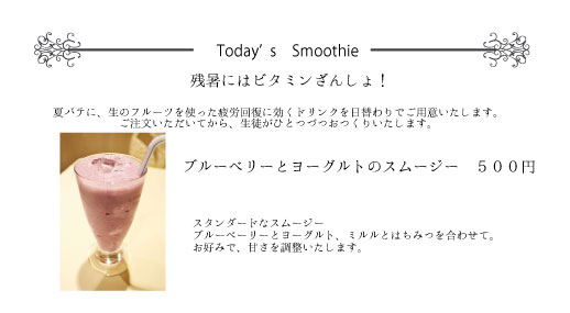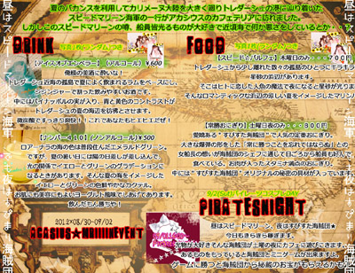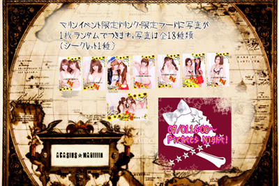 30日(月)〜8月5日(日) インダーラ・カレー イベント 暑い夏でもサラサラいけてしまう、辛いけど美味しい いろいろな種類のカレーを期間限定でご提供予定。 生徒も2名がインダーラの民族衣装サリーを着用しています。 FOOD 日替わりインダーラカレー 800円 日替わりとなりますので、生徒にお尋ねください。 ※写真はサグチキンカレー(ホウレン草と鶏肉のカレー) drink ★プレーンラッシー(ノンアル) 500円 インダーラの地方のヨーグルトのドリンクで カレーとの相性抜群! ★マンゴーラッシー(ノンアル) 500円 インダーラー地方のヨーグルトドリンクとマンゴーのラッシー デザート感覚で美味しく飲めます ※写真はマンゴーラッシーです。 ご注文をいただいてからおつくりいたします。 8月6日(月)〜8月12日(日) 夏休みの宿題? 絵日記を完成させて! 夏休みの宿題といえば、絵日記! ご来訪の皆様には、その日あった出来事を簡単に日記に書いてもらいます。 すると、なんと生徒がその日記の内容に合わせて イラストを描いてくれちゃいます。 お土産に持って返っても良いし、 反対側が残暑見舞いハガキになっているので残暑見舞いとして出しても良いし 持って帰るのが面倒なら、お店の壁に飾ってかえってもOKです。 でもせっかくですから、ひと夏のお土産にお持ち帰りください。 8月10日(金)〜8月12日(日) コミケで買ってきたもの見せてください! コミケで買ってきたもの見せてください。 見せて頂けたら、一緒にチェキを撮らせて頂きます。 買ってきた物は、2012年8月の発行年月日の表記があるもの もしくは、コミックマーケット82の表記があるもののみ対応 8月10日(金) 営業時間変更 8月10日(金)は、コミケ初日な為、14時オープンとなります。 他イベントも開催中ですので、お待ちせず14時よりご来訪ください。 通常 16:00−22:30 8月10日 14:00−22:30 8月13日(月)〜8月19日 あかしうす夏祭り 夏と言えばお祭り! 緋の諸島の文化である祭りをアカシウスで再現! 楽しく・明るく・元気にをコンセプトに賑やかな雰囲気でお祭りを盛り上げていきたいです。 生徒ははっぴか浴衣でお出迎えさせて頂きます。 【あかしうす夏祭り】のご案内です!! ついに!13日月曜からアカシウス夏祭り、はじまりますーーー!どんどんぱふぱふ!!! まずぷちいべんとのおしらせです! イベント期間の一週間にわたり写真くじをご用意いたしました!! その名も【マジLOVE100%くじ】!!! そ、そんなどっかで聞いたことある名前だなんて…そんなこと…ないんですからねっ!!!/// なんと!今回がんばりました!!! 全キャストそろっちゃいました!!! フロアもキッチンも本当にみんなが協力してくれたおかげでできました…! この場を借りて皆さんにありがとうございます!!! ピンショだけじゃなく集合もたくさん撮らせてもらってなんと全部で約90種類! 皆さんの大好きなあの子がいっぱいです/// ちなみに1回300円になります!くじびきですよ〜^^ という訳でさんぷるを!まずはありねえるりねえのベリルふたりですー! 一部分だけこっそり!みんなアカシウスオリジナルの法被姿です! 今回は緋の諸島の文化にだいぶあやかってみたので、いつもと違ったみんなの姿が見れると思います! アカシウス夏祭りイベントは一週間開催されますよ〜♪♪ 遅くなりましたがフードメニューのご案内にやって参りました! フードの名前はどこかで聞いたことあるような…ないような…?! きっと博識高いお客様には分かるはず!!是非楽しいメニュー名にも注目してみて下さい♪ ※フードは日程により変わりますので、ご注意下さい! 13日・15日提供メニュー ◎氷菓 400円 イチゴ味のかき氷です!暑い夏にぴったりー\(^o^)/! ◎うー(」・ω・)」にゃー(/・ω・)/ばにゃにゃ☆ 400円 かやや特製のチョコバナナです!イチゴとスイートチョコの2種類からお選びください!! 14日・16日提供メニュー ◎あの日食べた焼きそばの味を僕たちはまだ知らない。 800円 なんと!生徒が皆さんの目の前で焼いてご提供!!! パックに詰めて屋台風にお出しします(⌒▽⌒)!! ※こちらは提供時間が限られております!日誌で随時お知らせしますね! 全日程提供メニュー ◎きゅり球 300円 おまつりメニューといえばこれ!! きゅうりの一本漬けです(⌒▽⌒)wお酒のおつまみにもぜひ!! 17日の金曜日にはあのメニューのリベンジがあるかも…!? 各メニュー数に限りがありますので品切になる場合があります、そのときはご容赦ください(>_<) フード名に隠された今話題のワード気がつきましたか? 次にイベント限定ドリンクを紹介しまーす☆ 写真左の赤いドリンク!! アルコールの 「Fight-zero-」400円 かつて某国の戦争時に勝利を願って飲んだとされる決闘のドリンク。 グレープフルーツジュースとカシスが入ったちょっと甘めのシュワシュワなアルコール♪ 写真右の青いドリンク!! ノンアルコールの 「創聖のアクエリアス」400円 1万2000年前から受け継がれた愛し合った者達の思いが込められた愛のドリンク。 ブルーシロップやライムリキュールが入ったさっぱり