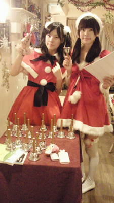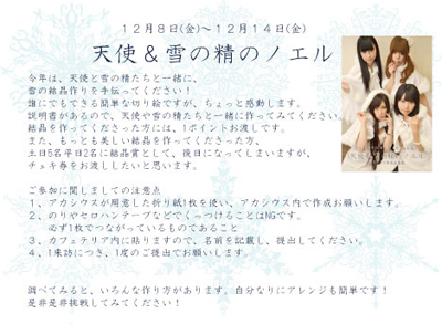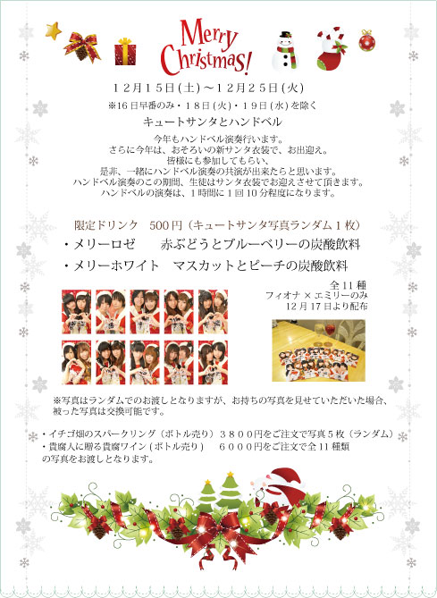 12月1日(土)〜12月7日(金) <12月4日をのぞく> 年賀状をお渡ししたい 12月1日(土)〜12月7日(金)の期間にご来訪頂き、お申し込み頂けると、 アカシウス寄宿舎学園より年賀状を受け取るイベント 受け取り方は 自宅に受領したい方は自宅へ郵送 来店して受け取りたい方は来店して1月1日以降に受け取り もちろん郵送でも無料です 今年は、巳年!へびの着ぐるみを着て、みんなで習字をする予定です!とっても楽しみ! 12月4日(金) ★しのぐ&ありあBIRTHDAY☆ ごきげんぱっぴー!!ありあです☆ 今年も同じ12月4日生まれの、しのぐありあコンビで当日の12月4日にBIRTHDAYイベントをやらせて頂く事になりましたっ♪ 当日はお誕生イベント限定のフードやドリンクメニューをご用意してお待ちしています★ 衣装も普段とは違うお洋服ですょ♪←普段あんまり見れないしのぐ様の凄いのが見れちゃうかも!? 12月4日しのぐありあBIRTHDAYイベントお待ちしております♪ 12月8日(金)〜12月14日(金) 天使&雪の精のノエル 天使&雪の精のノエル 今年は、天使と雪の精たちと一緒に、雪の結晶作りを手伝ってください! 誰にでもできる簡単な切り絵ですが、ちょっと感動します。 説明書があるので、天使や雪の精たちと一緒に作ってみてください。 結晶を作ってくださった方には、1ポイントお渡しです。 また、もっとも美しい結晶を作ってくださった方、 土日5名平日2名に結晶賞として、後日になってしまいますが、 チェキ券をお渡ししたいと思います。 ご参加に関しましての注意点 1、アカシウスが用意した折り紙1枚を使い、アカシウス内で作成お願いします。 2、のりやセロハンテープなどでくっつけることはNGです。 必ず1枚でつながっているものであること 3、カフェテリア内に貼りますので、名前を記載し、提出してください。 4、1来訪につき、1度のご提出でお願いします。 ちなみに、私も作ってみました! あんまり器用ではないほうですが、こんな感じで、 最終的には下書きを無視して切り進みました。 広げてみると、こんな綺麗に! はじめて作ってみましたが、感動!!!!です。 調べてみると、いろんな切り方や模様もさまざま。自分なりにアレンジも簡単! 是非是非挑戦してみてくださいね。 12月10日(月)〜1月3日(木) 特得チケット発売 年末と6月に販売している特得チケット 今年末も、12月10(月)〜1月3日(木)までの期間販売致します。 再来年は、消費税が上がるかもしれないので、来年末は販売しないかも 1回分お得な回数券、チェキ券付き、ポイント2倍 と3拍子揃ったチケットです。 『アカシウス寄宿舎学園 特得チケット』とは、 1時間滞在料金10回分の価格で −1枚分お得になり11回(11時間分)使え −さらにチェキ券が1枚付いてきて −購入時にポイントが2倍 なる大変お得なチケット 2つほど制限が付いてます。 -1日1枚のみ使用可能 -有効期限:2013年12月31日まで 有効期限は、あまり関係ないかもしれませんが一応1年間 何度か来られる予定があるなら買っておいて損は無いチケット 買ったその日にも使えるでの、何度か来訪予定ならぜったい買いです! 発売期間は、1月3日までか、売り切れるまでとなります。 12月15日(土)〜12月25日(火) ※18日(火)・19日(水)を除く キュートサンタとハンドベル 今年もハンドベル演奏行います。 さらに今年は、おそろいの新サンタ衣装で、お出迎え。 皆様にも参加してもらい、 是非、一緒にハンドベル演奏の共演が出来たらと思います。 ハンドベルの演奏は、1時間に1回10分程度になります。 限定ドリンク 500円(キュートサンタ写真ランダム1枚) ・メリーロゼ 赤ぶどうとブルーベリーの炭酸飲料 ・メリーホワイト マスカットとピーチの炭酸飲料 全11種 (※フィオナ×エミリーのみ12月17日より配布) ※写真はランダムでのお渡しとなりますが、お持ちの写真を見せていただいた場合、 被った写真は交換可能です。 ・イチゴ畑のスパークリング(ボトル売り)3800円をご注文で写真5枚(ランダム) ・貴腐人に贈る貴腐ワイン(ボトル売り) 6000円をご注文で全11種類 の写真をお渡しとなります。 今年の衣装はとっても可愛いです! みんなの写真もとっても可愛いです。 生徒にも大好評で、 大好きなハンドベルも始まるので、すごく楽しみです。 12月16日(日) ミツキ・彩 バースディ イベント ミツキと彩という珍しいコンビでのバースディイベント 是非、お楽しみに 詳しくは、後日Blogにて 12月18日(火)・19日(水) カレンダーファッションショー ハンドベル期間中のプチイベント 2012年の1〜12月のカレンダー衣装をもう一度生でお披露目 21時からだけのプチイベントですが、是非、見にいらしてください。 12月18日(火) カレンダーROMプレゼント 毎月販売している卓上カレンダーを1年間買い続けて頂いた方への 秘蔵写真のCD-ROMのお渡しを20日よりさせて頂きます。 大変ご面倒ではありますが、2月〜12月分のカレンダー11枚を ご持参のうえ、生徒にお声をおかけください。 カレンダーに使用した写真と未公開の写真を収録。 カレンダーには出てこなかっ