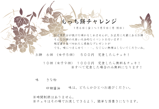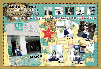 1月1日(日) 年賀状お渡し(受付された方) 12月2日(金)〜12月9日(金)の年賀状をお渡ししたいイベント! で登録頂いた方で、お店での受け取りを希望された方への年賀状お渡し開始 1月1日(日)〜1月5日(木) 巫女服でお出迎え 緋の諸島のお正月の風物詩である初詣気分を味わって頂きたく エルファイの丘を登り…女神にお祈りしてきた後は、 アカシウスで、お神酒を飲みながら、巫女達の姿を見、おみくじを楽しんでください。 イベント内容: ●アカシウスの生徒達が巫女服でお出迎えします。 ●ご来訪の皆様へ、お神酒を振舞わせて頂きます。(お神酒なので無料です) ●アカシウス寄宿舎学園 おみくじ を用意します。 1月6日(金)〜1月9日(月 祝日) もっち餅チャレンジ お正月気分が抜けた頃かもしれませんが、お正月に大量にあるお餅 そんなお餅の大食い大会的なイベントを行います! 規定量を食べ切れたら素敵なプレゼントが でも、喉につまらせて・・・、なぐらい無理はしないでくださいね。 お餅 6個 〈女子5個) 500円 完食したらチェキ! 10個(女子9個) 1000円 完食したら無料&チェキ! ※すべて完食した場合のみ無料になります! 味 きな粉もしくは、砂糖醤油 ※時間制限はありません。 ※チェキはその場でお渡しできるよう、簡単な落書きになります。 1月10日(火)〜1月12日(木) 休業日(お休み) 1月10日(火)から3日間。店内改装の為、お休みいたします。 1月13日(金)〜1月20日(金) 辰(龍)年 featuring with イザラード 今年は辰年という事でドラゴンの年! そしてドラゴンといえばイザラード! そんな2つの要素をコラボしたイベントを開催します。 可愛くないかも、でも…カッコいい!そんあイザラード服(チャイナ服)を見てみたいです。 1月14日(土) アスティ・凛 バースディイベント 詳細は後日Blogにて 1月20日(金) 2月のカレンダー発売 個性豊かな生徒が集まるアカシウス。 あらゆるジャンルの洋服を着こなす生徒たち。 ある生徒が言いました。 「みんなの持ってる洋服を交換して着たい!普段は 着ない洋服に、挑戦してみるのも、面白そう!」 ということで、 2012年来年のカレンダーは、 「私服交換カレンダー」となりました。 最低1着以上の自分の私服を持ってきて みんなに着てもらいます。 2月カレンダーは、アリア担当。 アリアからコメントです。 「2月なので、ちょっとバレンタインみたいなお洋服を意識しました☆ ポイントはくまのお人形です! みんなに可愛く持ってもらいました。 特典写真は、お揃いのワンピースを着た2ショットの写真が入っています。」 今年も、もちろん、来月のカレンダー発売まで、 写真が付いてきます! 1部500円(ランダム写真付・ケース希望の場合はお申し付けください) 2月〜12月まで購入でプレゼントをお渡しの予定ですので、 是非、集めてみてください。 特典写真は、 4枚の写真から1枚(ランダム)お渡しです。 すべてツーショット写真です。 毎月販売している次の月のカレンダー 今年は生徒の誰か1人の私服を持ち込んで皆に来てもらいます。 個性豊かな生徒が集まるアカシウス。 あらゆるジャンルの洋服を着こなす生徒たち。 ある生徒が言いました。 「みんなの持ってる洋服を交換して着たい! 普段は着ない洋服に、挑戦してみるのも、面白そう!」 ということで、 今年は 「私服交換カレンダー」となりました。 最低1着以上の自分の私服を持ってきて みんなに着てもらいます。 過去のカレンダーサンプル 1月22日(日)〜24日(火) 体を温めて、風邪予防にも!1月22日〜24日(3日間限定)生姜湯 100円 1月22日〜24日(3日間限定)生姜湯 100円 生姜を生で食べると、体内の白血球数が増えます! 白血球は体内に侵入した風邪のウィルスや細菌と戦い身体を 守ってくれる免疫細胞なので、生の生姜には免疫力を高める 効果があり、生姜に熱を加えて食べると血行が良くなるという 効果があるそうです。 体を温めて、風邪予防にも! 寒さに負けないために。 1月25日(水)〜2月1日(水) ふわふわもこもこルームウェアinアカシウス 最近、可愛いふわふわでもこもこの マシュマロみたいなルームウェアが流行っていて、 とっても可愛いので、 私たちも、 ふわもこなルームウェアを着て 寒さをのりきり、女子力を高めたいと思います。 ちょっぴり着てもらったら、すっごく可愛いです。 うさぎさんとくまさんがいるよ。 焼き菓子の日: (毎週土曜、祝日) 毎週土曜日と祝日は、『焼き菓子の日』! 時間は未定(12時前後)なので、 学級日誌BLOGをチェックして、焼きたてを食べに来てくださいね。 アカシウス焼きたてベーカリーの日: (毎週日曜日) 焼き菓子の日だけでは飽きる…との事で始めた石鹸プレゼントでしたが やはりカフェなので、食べ物の方が良い・・・ との事で、日曜日は、『アカシウス焼きたてベーカリーの日』に 日曜日の朝に焼きたてのパンをご提供 有料ですが、とっても美味しいので、是非、召し上がってみてください。 それぞれのイベント毎の詳細は、こちらのWeb、もしくは学級日誌Blogで告知をしていきますので、