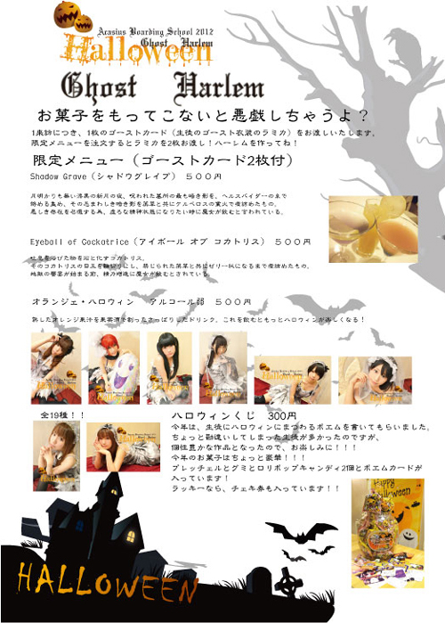 10月1日(月) 休業日 9月24日(月)〜10月14日(日) 収穫祭 オクトーバーフェスト 9月の最終週から初めているオクトーバーフェスタ=収穫祭 フェスタなどでしか提供されていない珍しいビールもご用意し 通常にはないビールと食が進むお料理もご提供いたします。 オクトーバーフェストの掛け声 Ein Prosit, Ein Prosit (アイン プロージット さあ乾杯しよう) ビールを飲むときの掛け声は是非 eins (アインス 1)、zwei (ツヴァイ 2)、drei (ドライ 3) g‘suffa ! (ズッファ!! 飲み干せ) Prost (プロースト!! 乾杯) ★イベントビール★ シュパーテン オクトーバーフェストビア(500ml) 900円 世界最大級のビール祭り【オクトーバーフェスト】で、ビールをふるまうことが許されている6つの公式ブルワリーのひとつであるシュパーテン社のオクトーバーフェストビア。しかもミュンヘン市長がこのシュパーテン社の樽を割ることでオクトーバーフェスト祭りが始まるほど、中心的な役割を果たしているビール。 一般のオクトーバーフェストイベントでは恐らく1200〜1500円で販売されてるビール ですが超サービス価格900円で販売! お店にいつもある物より1.5倍程度、瓶が大きいでの飲み応えあり ただ数が限られておるから、お1人1日1本までとさせてもらいます。 1年に1回だけ、それも周りではめったに飲む事が出来ないビールなので 話のネタに是非飲んでみてください。 (すみません。既にサービス価格な為、アルコール3杯セットには含まれません) ★イベントフード★ 第1週目(9/24-9/30) イベントフード 『ドラコヌール王国風 自家製カリーヴルスト』 500円 竜騎士達の野外料理ドラコリアンで有名なドラコヌール王国で食堂で好まれるのおつまみ ドイツでビールのツマミと言えばこれという料理 荒びきフランクに、トマトとワインで煮込まれた自家製のソースをドバッとかけ カレー粉を振り掛けた料理 これも、ここまで本格的なカリーヴルストは、なかなか食べれませんので、是非。 第2週目(10/2〜10/7) 『お肉ガッツリ ミートローフ』 普通、ミートローフは、パウンドケーキ型などの長方形の型で焼きますが 丸いケーキ型で焼いているもんだから大きい、お肉ガッツリです。 今年は隠し味も利かせてみようと思います。 第3週目 (10/8〜10/14) 『鶏肉の香草チーズ焼き』 一晩ミルク漬けにして柔らかくした鶏肉をコンソメで煮込んでから チーズと香草で焼き上げた一品。 チーズのコクと、香草の爽やかさ、そして海塩のうまみが食をそそります。 10月6日(土)〜10月14日(日) 芸術部ROM予約受付 木々の緑がだんだんと赤く染まる季節、芸術の秋がやってきました。 今年もシュバルティ芸術学校に通う、あの生徒たちが、またアカシウスへ! 今回は皆様へ、シュバルティでの生活の様子を大公開。 芸術生たちの日常を覗き見できる、 イラスト、音楽、写真、…目で耳で楽しめるエンターテイメントROM! 知られざる芸術学校の全貌が明らかに! 芸術部的男子芸術生の日常をお楽しみください♪ 詳細はアカシウス生徒日誌にて。 11月の学園祭でイベントを予定している芸術部によるROM販売 その芸術部ROMの予約受付をこの期間行います。 10月8日(月 祝日) ハナ・バースディ 詳細は後日Blogをご参照ください。 10月9日(火)〜10月14日(日) アカシウス公式ニーソックス リボン付き販売 好評を頂いているアカシウス公式ニーソックスに、 この期間だけリボンクリップのおまけを付けての販売を行います。 生徒がサンプルを付けてみますので、是非、ご覧になって頂けたらと思います。 10月15日(月)、16日(火) Kuru Kuru Cafe 再び “チュン…チュンチュン…” 耳を澄ますと鳥のさえずりが聞こえ、そっと目を閉じると心地よい風を感じる ウキュラシアの森にひっそりとたたずむ“kuru kuru cafe”。 甘い香りに誘われてこのcafeにたどり着いた旅人は手作りスイーツを口にすると、 みな幸せな時間を過ごせるという言い伝えがあります。 お菓子作りが大好きな3人娘が営むこのcafeでは、その日に採れた森の恵みをふんだんに使って 毎日おいしいスイーツが提供されます。大自然に囲まれた静寂の中で、ほっとできる“kuru kuru cafe”どうぞお立ち寄り下さい♪ 10月17日(水)〜10月24日(水) ハロウィン第1弾 ゴーストハーレム ハロウィン第1弾ゴーストハーレム 今年のハロウィン1部目は、生徒がちょっとセクシーなゴースト(幽霊)に変装してお出迎え あんまり怖くないと思いますが… 飛んでる幽霊のスカートの中を覗いては行けません! 1来訪につき、1枚のゴーストカード(生徒のゴースト衣装のラミカ)をお渡しいたします。 限定メニューを注文するとラミカを2枚お渡し!ハーレムを作ってね! そして!!!毎年恒例 Trick or Treat お菓子を持ってこないとイタズラしちゃいます! お菓子を生徒にくれないと、手にマジック(?)でイタズラ書きをしちゃいます! 忘れてしまったら、店内に回避アイテムもあるのでご利用ください。 ハロウィン限定メニュー(ゴーストカード2枚付) Shadow Grave (シャドウグレイブ) 500円 月明かりも無い漆黒