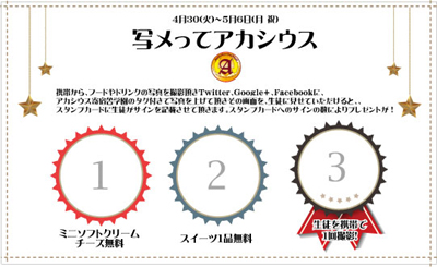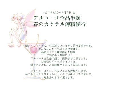 4月1日(月)〜4月5日(金) アルコール全品半額 春のカクテル錬精修行 暖かくなってきて、生徒達もノンビリし始める頃ですが、 そんなぼんやり気分を吹き飛ばす、春のカクテル錬精修行を開催。 ご来訪のお客様には、アルコールを全品半額でご提供させて頂きます。 お客様のイメージでといった、新カクテルも、ある程度リクエストに応じます。 ※キャストオリジナルカクテルも対象とします。 ※アルコール3杯セットは、元々お値引きしてますので、対象外とさせて頂きます。 4月6日(土)・7日(日) 「ACASIUS QUARTET」イベント ちょっぴりビターで大人な4人組が本気のLOVEをお届けします。 そして 来る!2013年4月6日(土)・7日(日)の二日間 緊急デビューライブ 「ACASIUS QUARTET LIVE FES〜君はつかのまの夢をみる〜」 (略して◇魂) 開催が決定!!! 恐らく今後このメンバーでこんなテンションの高いイベントは開催されないでしょう!! (実は憧れてました・・・笑) 当日は盛り上がる選曲で皆様と一緒につくるライブイベントにしたいと思いますので お見逃しなく!!! 4月8日(月) 休業日 4月9日(火)〜4月14日(日) アカシウスおにぎり握り選手権 おにぎり握りバトルセット(お茶付) 600円 良妻賢母を目指す、アカシウス寄宿舎学園の生徒としては 緋の諸島のおにぎりぐらい、うまく握れなくては! 毎日チーム対抗で、どっちが美味しいおにぎりを 握れるか投票してもらいます。 2チームに分かれ、おにぎりを作ってもらいます。 美味しかったおにぎりに投票してください。 投票が多かったチームには、賞金が! 本気のバトルに公平な審査を是非是非、お待ちしております。 4月15日(月)〜4月21日(日) ハイランドイベント ハイランド イベント 4月15日(月)〜4月21日(日)※21日凛卒業式を除く アカシウス皇国のあるカリメーヌ大陸の北西部山岳地方のティロールでは ハイランド高原地方独自の民族衣装・習慣があります。 乳製品が豊富な事は、リーフェンベルクとも共通する処もあり 今回、そんなハイランドのティロール地方の衣装に身を包み、 ハイランド地方の食べ物を召し上がってみて頂くイベントを 開催する運びとなりました。 限定メニューをご注文いただきますと、写真(4種類)もしくは、 生徒のツーショットチェキがあたるくじを引いていただきます。 チェキの確率は、1/3、 是非、記念にお持ち帰りいただけましたらと思います。 限定メニュー DORINK ハイランドハーブティ 500円 カモミールにジジンジャーの風味を加えて まだまだ肌寒いこの季節に ハイランドヨーグリート 500円 ハイランド地方で好んで飲まれてるブルーベリーの恵み たっぷりのヨーグルトドリンク 花粉にも、健康にも FOOD ハイランドチーズ白パン 600円 ハイランド地方で、小さな女の子に好れているチーズを乗せて焼きあげた白パン ベーコンとスクランブルエッグとオーロラソースが入っています。 サラダは、塩とオリーブオイルで SWEET ハイランドスイーツフォンデュ 600円 ハイランド地方で、客人をもてなす際に出されるというフォンデュなスイーツ いろいろな具材をチョコにからめて召し上がってみてください。 いちご・ブルーベリー・クッキー・マシュマロを 暖かいチョコレートにつけて 今回の衣装は実際に着てもらったらとっても可愛い仕上がりに! 可愛くてカラフルな生地や柄、ニュアンスを楽しんでもらえると思います。 是非是非、実物を見てもらえたら嬉しいです。 4月20日(土) 5月のカレンダー発売 1部500円 (ランダム写真付・ケース希望の場合はお申し付けください) 2013年のカレンダーは、部活カレンダー!!! 5月は芸術部。 4人のメンバーが揃っての撮影もこれが最後! という事で、とっても気合いの入ったカレンダーに 仕上げてくれました。 おまけの写真も見ごたえたっぷり!!です。 今回も、もちろん、来月のカレンダー発売まで、写真が付いてきます! 1部500円(ランダム写真付・ケース希望の場合はお申し付けください) 全部の月を揃えると大きな写真の入った 未収録の写真を含むカレンダーの特典ROMをお渡しする予定です!å 是非、揃えてみてくださいね! 2013年のカレンダーは、部活カレンダー!!! 今回も、もちろん、来月のカレンダー発売まで、写真が付いてきます! 1部500円(ランダム写真付・ケース希望の場合はお申し付けください) 全部の月を揃えると大きな写真の入った 未収録の写真を含むカレンダーの特典ROMをお渡しする予定です! 是非、揃えてみてくださいね! 2013年のカレンダーは、部活カレンダー!!! その月にふさわしい部活が担当し、メンバーや活動を紹介します。 毎月部活によって、デザインやイメージが全く変わるところが見どころです! 過去のカレンダーサンプル 4月21日(日) 凛 卒業式 詳細は、後日Blogにて 4月22日(月)〜4月29日(月 祝) 目覚ましボイス プレゼント 暁が覚えられないぐらい気持ち良い春眠の季節 ともかく…、とても気持ちよく寝れる今日この頃 出来れば起きたくないですが、起きなきゃ行けない! 特に、新社会人の方々は、絶対に寝坊な