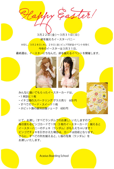 3月4日(月)〜3月14日(木) C&C (チョコ & カード) ホワイト イベント 1来店につき1枚キャストの手作りオリジナルカード とホワイトチョコを1つお渡しです!! バレンタインデーの時と同じくこの期間限定の特別カードです。 今回も、みんなには寮に帰ってからの 宿題としてがんばってもらっていました。 チョコは手作りです!! ホワイトチョコですが、クランチタイプで食べやすいと思います。 キャストの手作りオリジナルカードですが ●1来店につき1枚ランダムのお渡し ●今月のスイーツをご注文頂いた方へも追加で1枚ランダムでお渡し ●Valentineのお返しを頂いた方へも追加で1枚ランダムでお渡し ●限定ドリンクを注文した方へ、希望カードをお渡しします。 イベント限定ドリンク ホワイトキャラメリーぜ 300円 今回も好きなカードを選べるので、ファイルから好きなものを選んでね 3月15日(金)〜3月20日(水 祝) フェアリーカーニバル アカシウスの妖精達の春を祝うカーニバル 詳細は後日 3月18日(月)・19日(火) アイドルイベント 詳細は後日Blogにて 3月21日(木) 休業日 3月21日は、お休みさせて頂きます。 お知りおき頂きますよう、お願い致します。 3月22日(金)〜3月31日(日) <※28日(木)、29日(金)ピュア同好会イベントを除く> 卵を揃えろイースターバニー 今年のイースターは3月31日。 最終週は、イースターにちなんだ、卵を揃えるイベントを開催します。 みんなに描いてもらったイースターカードは、 ・1来訪に1枚 ・イチゴ畑のスパークリング グラス売り 600円1枚 ・すべてのフード・スイーツ1枚 ・ホビット族の疲労回復シェーク 600円1枚 にて、お渡し(すべてランダムでのお渡し)いたしますので、 毎日変わるビンゴカードで1列(3枚のイースターカード)揃えると イースターバニーのチェキ(ランダム)がもらえちゃいます! ビンゴでチェキを引きかえた場合は、カードは回収となります。 さらに、すべての列を揃えると、L版の写真(ランダム)を お渡しいたします。 カードもとっても可愛くって見てるだけでも楽しくなってしまいます! イースターバニーの衣装も頑張って着ているので、 是非チェキもらってもらえたらと思います!!! 3月22日(金) 4月のカレンダー発売 1部500円 (ランダム写真付・ケース希望の場合はお申し付けください) 2013年のカレンダーは、部活カレンダー!!! 4月はぴゅあ同好会。 4月ということで、セーラー服をきてくれました! 実は、結構な頻度でイベントを開催しているぴゅあ同好会。 今月末にも新たなぴゅあに挑戦をするべく頑張っているようです。 今回も、もちろん、来月のカレンダー発売まで、写真が付いてきます! 1部500円(ランダム写真付・ケース希望の場合はお申し付けください) 全部の月を揃えると大きな写真の入った 未収録の写真を含むカレンダーの特典ROMをお渡しする予定です! 是非、揃えてみてくださいね! 2013年のカレンダーは、部活カレンダー!!! その月にふさわしい部活が担当し、メンバーや活動を紹介します。 毎月部活によって、デザインやイメージが全く変わるところが見どころです! 過去のカレンダーサンプル 3月28日(木)、29日(金) ピュア同好会イベント 詳細は後日Blogにて 3月31日(日) リコ バースディ 詳細は後日Blogにて 焼き菓子の日: (毎週土曜、祝日) 毎週土曜日と祝日は、『焼き菓子の日』! 時間は未定(12時前後)なので、 学級日誌BLOGをチェックして、焼きたてを食べに来てくださいね。 アカシウス焼きたてベーカリーの日: (毎週日曜日) 焼き菓子の日だけでは飽きる…との事で始めた石鹸プレゼントでしたが やはりカフェなので、食べ物の方が良い・・・ との事で、日曜日は、『アカシウス焼きたてベーカリーの日』に 日曜日の朝に焼きたてのパンをご提供 有料ですが、とっても美味しいので、是非、召し上がってみてください。 それぞれのイベント毎の詳細は、こちらのWeb、もしくは学級日誌Blogで告知をしていきますので、ご期待ください。