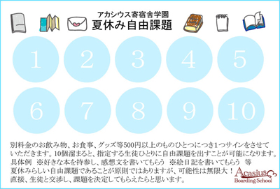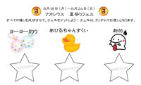 〜8月3日(日) インダーラのスタミナ・カレーイベント 超力スタミナカレーにチャレンジ 本格的に暑くなり、スタミナ抜群のカレーを食べて スタミナを付けてもらいたいと、 精が付く材料をふんだんに入れたカレーを作ります。 多彩なスタミナーカレーを、インダーラの衣装に身を包んだ生徒がご提供。 暑さに負けないスタミナを付けて頂きます。 超力スタミナカレー800円(税込) マンゴーラッシー500円(税込) ★超力スタミナカレー+マンゴーラッシーセット1000円(税込) スタミナカレーを3回食すると、記念にチェキが撮影できます。 写真は、おでこにつけるアクセサリーのビンディ! 本格的な民族衣装に包まれる妖艶な生徒たちの 着こなしも楽しみです。 8月4日(月)〜8月17日(日) ラグーン・ヴィラ・カフェ (Lagoon Villa Cafe) 1週目 2週目 アカシウス今世紀最大の水着イベント開催です! 海にちなんで南の島のラグジュアリーなヴィラをイメージしたイベントを開催。 南の島のリゾートで提供されるような、ちょっと贅沢な海辺の空間を演出します。 水着のイベントは、4,5年ぶり!! みんな頑張ってくれたので、とても貴重です。 水着の写真には一人2種類あり、 コンフォート(Comfort)がアップの写真 ラグジュアリー(Luxury)がヒキ(全身)の写真になります。 1来訪につき1枚、コンフォート(Comfort)タイプの写真をランダムでお渡し、 イベント限定ドリンク・フードを注文でラグジュアリー(Luxury)タイプの写真をランダムでお渡しとなります。 イベント限定メニュー ブルーウォーター800円(税込) 1週目 トニックウォーターにライム、レモン、オレンジをたっぷり入れたノンアルコールドリンク 自家製サングリア(アルコール・ノンアルコール)800円(税込) 2週目 はちみつとレモンで漬けたオレンジ・リンゴ・ブルーベリーの入った自家製サングリア ノンアルコールとアルコールがあります。 パイガッパオ800円(税込) 8月4日(月)〜8月10日(日) 鶏挽肉をナンプラーで炒めバジルで香りをつけた、南国の満腹ボウル トロピカルサテ―プレート 8月11日(月)〜8月17日(日) ご飯無し 800円(税込)、ご飯付き 900円(税込) 南国風串焼きのサテー。 特徴的な下味が付き、特徴的なソースで食べる南国風串焼きですが ご飯と一緒でも食べやすいように串無しでご提供。 鶏モモ肉、ネギ、豚角肉、エビをグリルした豪華プレートです。 ピーナッツバターがふんだんに入った一風変わったサテーソース をたっぷり付けて召し上がってみてください。 ラグーンヴィラセット 1万2千円(税込) コンフォート(5枚)+ラグジュアリー(5枚)+皇国晩餐会のシャンパーニュ(ボトル) ※こちらのセットのご注文は、持っているものを見せていただけると、 被ったものは交換可能です。 8月4日(月)〜8月10日(日) 前半 ネコモ、 リセ、 ハナ、 アリア、 カトラ、 マリリア コハル、 ミトハチ、 ミツキ 8月11日(月)〜8月17日(日) 後半 ミィナ、 ティオ、 ユーイ、 サクナ、 エミリー フィオナ、 リコ、 ウキュラ、 ショコラ、 マイコ 是非是非、夏を満喫しにアカシウスへ! 8月15日(金) 営業時間変更 8月15日(金)は14時オープン致します。 (通常、平日16時オープンの所、14時オープンに) 8月15日(金)〜8月17日(日)限定 遠方から来たらアカシウスでチェキ! 関東以外(東京都・埼玉県・千葉県・神奈川県の外)から ご来訪頂いた方は、無料でチェキ撮影をプレゼント! コミケ期間に地方から遊びに来ている方、 是非、夏の思い出を作りに 池袋にあるアカシウスに遊びに来て、いろんなお話聞かせてくださいね! 8月18日(月)〜8月24日(日) 夏祭りフェス 浴衣を着て、お祭りに行きたい!そんな夏祭りをイメージしたイベントです。 今回の浴衣は華やかに、鮮やかな、 少し着物のテイストがはいった浴衣です。 もちろん、今回も浴衣を着て来てくれたらチェキ撮れます! 浴衣姿は見ているだけで涼しくなります。 是非、納涼はアカシウスへ! 夏祭りフェス催し すべての催しを成功させて、チェキをゲットしよう! ・ヨーヨー釣り(1来訪に1回)無料 ・あひるちゃんすくい(1来訪に1回)300円 5匹以上すくえたら、成功! 4匹以下でも駄菓子プレゼント! ・射的(1来訪に1回/3発)300円 3発すべて倒したら成功! 倒せなくても駄菓子プレゼント! ※期間中、滞在許可証発行所は、射的場になります。 是非、思い出に挑戦してみてくださいね! 8月20日(水) 9月のカレンダー販売 2014年は、365日アカシウス!オールスターズカレンダーです。 今年は、生徒全員で作る365日アカシウスというテーマで作成しました。 全員がお気に入りの写真を1枚づつ提供して作っていきます。 少し、季節がずれてしまうかもしれませんが、 日々を大切に、忘れない思い出として365日を綴っていきたいという想いから このような形になりました。 参加できなかったイベントの写真や 誰かの日常を垣間見たりすることもでき、 個性溢れるアカシウスを一枚で表現できるカレンダーです。 誰が撮ったか、誰の写真か当ててみるのも楽しいです。 今回の特典は、写真ではなく、 オー