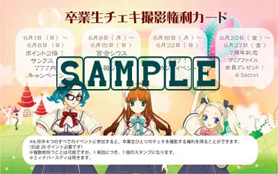 6月28日(土)〜6月30日(月) 卒業生訪問イベント 過去に卒業した生徒を呼んでの同窓会イベント! 6月中の4つのイベントに参加すると卒業生のチェキを取る権利が! 卒業生チェキ撮影権利カードを6月1日〜6月8日の間にお渡しいたします。 訪問する卒業生メンバー アスナ エマコ ケーナ 彩 ユウ ラシュ ルリカ 誰がいつ来るかはお楽しみに! ※混雑時は1時間30分制となります。 ※チェキはひとりにつき1枚の卒業生チェキ撮影権利カードが必要となります。 卒業生訪問イベントの卒業生チェキ撮影の権利カードです。 6月中に行われる4つのイベントすべてに参加すると 撮影の権利を獲得することができます(別途20ポイント必要)。 卒業生ひとり1枚のチェキにつき1枚必要になります。 複数枚持つことは可能ですが、 1来訪につき、1個のスタンプになります。 焼き菓子の日: (毎週土曜、祝日) 毎週土曜日と祝日は、『焼き菓子の日』! 時間は未定(12時前後)なので、 学級日誌BLOGをチェックして、焼きたてを食べに来てくださいね。 アカシウス焼きたてベーカリーの日: (毎週日曜日) 焼き菓子の日だけでは飽きる…との事で始めた石鹸プレゼントでしたが やはりカフェなので、食べ物の方が良い・・・ との事で、日曜日は、『アカシウス焼きたてベーカリーの日』に 日曜日の朝に焼きたてのパンをご提供 有料ですが、とっても美味しいので、是非、召し上がってみてください。 それぞれのイベント毎の詳細は、こちらのWeb、もしくは学級日誌Blogで告知をしていきますので、ご期待ください。