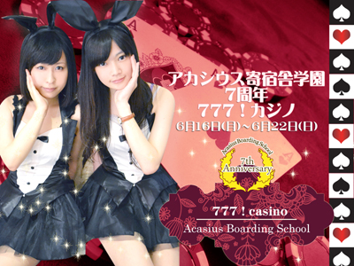 黒木祐大朗(英名:ユータ・アルファルド・ブラック) 緋の諸島で500年続く由緒正しきシャーマンの一族の末裔。 ちっちゃい頃から持ち霊とばかり話していたら皆に気持ち悪がられて、 健やかに根暗に育った。 このままでは世に出せないと困った一族の長に単身留学に追い出され、 今に至る。 性格はひねくれている。変態気質。強いられるのは、嫌いじゃない。 ハル・オーイモ・ポンパドウル はるばる遠くから来た謎の留学生。 パンとじゃがいもばかり食べているが腹具合を悪くしがち。 どこから来てどこへ向かうのかが不明であるが、 学園でのくらしは楽しいのでご機嫌である。 テディ・クラウン・ハルデンベルク 国内でも有数のドラゴンの調教師一族ハルデンベルク家の嫡子。 しかし調教師としてのセンスは無く ドラゴンを素手でどうにかしようとするためいつもどこかケガをしている。 争い事は面倒なので長いものには巻かれて生きていたい。 ナッツ・リト・ビーレフェルト ビーレフェルト家の四男坊。 強気男勝りな兄達の喧嘩によく巻き込まれ弱気臆病な性格に育つ。 良く言えば平和主義者で温厚。 可愛い物が大好きでひっそりとぬいぐるみ集めが趣味。 ネコム・ラ・キッドソン キッドソン家の一人っ子で自由に育つ。 楽しい事が大好きだけど マイペースでいつもフラフラしてる。 【缶バッチ、主な楽しみ方講座。】 1.集める! コンプリートを目指して頑張るっス(`・ω・´)☆ 2.好きなカップリングでくっつける! 例えば…まいこおねーさまとうきゅらをくっつけてにゃんにゃん妄想したり…/// 好きなカップリングは皆さんの自由自在*\(^o^)/*なんて素敵なドリーム企画*゚+.。:;+.:;。+゚* 3.無限回収! コアなファンな方!おれはネコム推しだからネコムを無限回収するぜーっ☆!!←これも楽しみ方の1つです! 4.今日の気分♪ 占い感覚でガチャガチャ回します! 今日はアリアがでた!1日ぱっぴーで過ごすぞーっヾ(●´∀`●)☆ 楽しみ方は人それぞれです♪ こんな感じでガチャガチャ回して楽しんで下さい(*´艸`*) ここから注意事項です☆ ★ガチャガチャは500円で回せますが、【100円玉のみとなっております】ので、皆様なるべく予め100円玉のご用意のご協力をお願い致します(>_<)! ★ガチャガチャ分も【ポイントが付きます】ので、ガチャガチャを引いたらお席で生徒と引いた回数の確認をさせて頂きます♪ その際、カプセルは回収させて頂きますのでご了承下さいm(_ _)m そして2つ目の大事なお知らせが!! 百合薔薇イベント1週間のイベント中で5日間ご来訪で感謝の気持ちを込めまして、 特典ではお渡ししていない未公開写真セットをプレゼントさせて頂きますヽ(*´∀`*)ノ.+゚!!やったーーっ☆ 更にイベント期間、7日間全てにご来訪頂くと…!!! 皆勤賞としまして最終日に生徒集合でチェキ撮影をさせて頂きます*\(^o^)/*!!!!おめでとぅございますっ!!! その日のお会計のレシートで何日間ご来訪したか確認させて頂きますので、レシートは捨てずにお手元に取っておいて下さいね(*´ω`*)♪ 限定ドリンク 各600円(税込み) •お姉様との約束(hot) カモミールがほのかに香る飲みやすいハーブティー♪あま〜いハチミツ付き♡ •兄弟の誓い(ice) ベリーと薔薇のエッセンスが入ったノンアルコールティーカクテル 限定カクテル 1200円(税込み) •ふたりの共同作業 カップリングの生徒2人が皆様のお席でお作りするスペシャルカクテル!カップリングによってどんな味になるのかは飲んでみてのお楽しみ♪ ◆百合カップル/ペシェベース ◆薔薇カップル/ジンベース 限定デザート 1000円(税込み) •秘密の花園 レアチーズケーキとショートケーキの2つの味が楽しめる秘密のケーキプレート ※一点ご注文に付きランダムで1枚甘いひとときを切り取った「カップル写真(ポストカードサイズ)」をプレゼント! 男子校生徒達と、女子校生徒達の秘密の写真を是非ゲットして下さい!! 写真には素敵なポエムが添えられているのでこちらも必見です!!! 6月11日(水)〜6月30日(月) 特得チケット発売 昨年末も販売した特得チケットを、 6月11日(水)〜6月30日(月)の期間販売致します。 1回分お得な回数券、チェキ券付き、ポイント2倍 と3拍子揃ったチケットです。 『アカシウス寄宿舎学園 特得チケット』とは、 1時間滞在料金10回分の価格で −1枚分お得になり11回(11時間分)使え −さらにチェキ券が1枚付いてきて −購入時にポイントが2倍 なる大変お得なチケットです。 チケットの使用には、2つほど制限が付きます。 −1日1枚のみ使用可能 −有効期限:2015年6月30日まで 有効期限は、あまり関係ないかもしれんが一応1年間 使い切るのに最短で11日掛かりますが 何度か来られる予定があるなら買っておいて損は無いチケット 買ったその日にも使えるでの、今後、なんどか来訪予定なら買い! 発売期間は、6月30日までか、売り切れるまで 6月16日(月)〜6月22日(日) 777!カジノイベント まず6月16日〜19日の4日間限定イベント衣装ドリンクガール着用です。 ゲームは7日間 1来訪につ