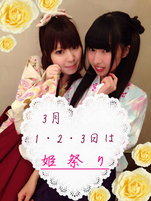 3月1日(土)〜3月3日(月) 姫祭り 今年の姫祭りは、 姫部部員のアリアお姉さま、ミィナさん、 そして、サポートメンバーのリコさん、カトラでおこなっていきます♪ @\姫祭り開催期間/ ・・・3日間限定のイベントなので、要注意☆ A\ゲームについて/ ・・・1来訪に付き1回チャレンジ出来るゲームです!スペシャル写真がもらえるチャンス☆ 一来訪に1回チャレンジ出来る 【花札めくりゲーム!!】 花札ゲームをご用意致しました☆ 皆様のお席で裏っ返しでシャッフルし、見事指定の花のカードを引き当てましたら このカードゲームでしかゲット出来ない 特別な『ぉ姫さま仕様のぉ写真』をプレゼント!!!! (全6種類) フィーバータイム 3月1日(土)、2日(日) 11:00〜14:00までの間!!!! B\お花持参で何かが起こる...!?/ ・・・生花をご持参頂くとラッキーな事が...☆ 当日お花を持って来て下さったお客様に限り、もう1回花札ゲームに挑戦することが出来ます(*≧∀≦*) つまりその日に合計2回ゲームが出来ちゃうことになります♪ 持って来て下さったお花は当日その場で花瓶に入れお席に飾らせて頂きます(*^^*) ちなみにレプリカのお花は申し訳ありませんが今回はNGとさせていただきます(´;ω;`)生花でよろしくお願いします〜!!! もちろん1本からOKなので、無理のない程度にご参加いただければ嬉しいです♪ カフェテリアがお花でいっぱいになることをメンバー一同期待してお待ちしていますっっ(笑) そんな訳で! 土日〜14時までのフィーバータイムも含め、お得なチャンス盛り沢山の花札ゲーム!! たくさんの皆様に楽しんでいただけますよーに…♪ C\限定メニューについて/ ・・・4人で一生懸命考えたメニューです!日替わりですよっ! <限定ドリンク> ・姫茶 500円 ノンアルコール ・桜物語 600円 アルコール <限定フード> ・桃色あんみつ 600円 (3月1日のみ提供) 桜のアイスがのったあんみつ ※桜アイスが苦手な方には、バニラアイスをのせます ・黒いおしるこ 600円 (3月2日のみ提供) 三色の白玉が入ったおしるこ ・姫の手づくりカレーライス 800円 (3月3日のみ提供) 姫部の限定フードといえばカレー!お花の人参でカレーも可愛く♡ そんな感じです!!! 3日間という短い期間ではありますが、 もりもり盛り沢山で、3日間全力で頑張らせて頂きます^^♪ 3月4日(火)〜3月14日(金) C&C (チョコ & カード) ホワイト イベント 1来店につき1枚キャストの手作りオリジナルカード とホワイトチョコを1つお渡しです!! バレンタインデーの時と同じくこの期間限定の特別カードです。 今回も、みんなには寮に帰ってからの 宿題としてがんばってもらっていました。 チョコは手作りです!! ホワイトチョコですが、クランチタイプで食べやすいと思います。 キャストの手作りオリジナルカードですが ●1来店につき1枚ランダムのお渡し ●今月のスイーツをご注文頂いた方へも追加で1枚ランダムでお渡し ●Valentineのお返しを頂いた方へも追加で1枚ランダムでお渡し ●限定ドリンクを注文した方へ、希望カードをお渡しします。 イベント限定ドリンク ホワイトキャラメリーぜ 300円 今回も好きなカードを選べるので、ファイルから好きなものを選んでね 3月7日(金) ラシュ卒業式 詳細は後日Blogにて 3月14日(金) 消費税アップ前の特得チケット発売 通常、6月と12月にしか販売していない特得チケットですが 今年は消費税アップ前の3月に特別に販売致します。 ただし昨年末の販売時より少し値上げして販売させて頂きます。 1回分お得な回数券、チェキ券付き、ポイント2倍 と3拍子揃ったチケットです。 今回の消費税アップ前の 『アカシウス寄宿舎学園 特得チケット』とは、 1時間滞在料金10回分+500円の価格で −1枚分お得になり11回(11時間分)使え −さらにチェキ券が1枚付いてきて −購入時にポイントが2倍 なる大変お得なチケット 2つほど制限が付いてます。 -1日1枚のみ使用可能 -有効期限:2015年3月31日まで 有効期限は、あまり関係ないかもしれませんが一応1年間 何度か来られる予定があるなら買っておいて損は無いチケット 買ったその日にも使えるでの、何度か来訪予定ならぜったい買いです! 発売期間は、3月31日までか、売り切れるまでとなります。 3月15日(土)〜3月22日(土) あなたのオリカク作ります! カクテル半額!練成レセプション 新入生もたくさん入り、オリジナルのカクテルもそろそろ作り始めたい頃。 実践をまじえて上達したいと思います。 新入生は練習、生徒たちはゲストのためにオリジナルのカクテルをお作り致します。 そんなレセプションです。 新入生は初めての写真撮影に挑戦!