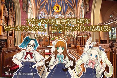 6月1日(月)〜6月30日(火) 1ヶ月間 ポイント2倍!キャンペーン アカシウス寄宿舎学園は、今年の6月で8周年を迎えます。 毎日、そして毎週、毎月いろいろな事に挑戦させていただき、 温かく見守っていただき、8年が経ち9年目を迎えます。 ささやかではありますが、 6月1日〜30日の間、ポイント2倍になります。 6月1日(月)〜6月7日(日) 特得チケット使用制限解禁 6月1日(月)〜6月7日(日)の期間、1日1枚しか使用できない特得チケットの 使用制限を解禁し、1日何枚でも使用可能とします。 新しい特得チケット発売に前に、前の物がすこし余っているな〜という方は 是非、この期間に、使用してみて貰えたらと思います。 6月1日(月)〜6月7日(日) 理想のマリッジをリサーチ ゴールドランクで結婚(仮)が解禁されたことにより、 将来の事をいろいろ調べておくのも必要かも そこで生徒を指名し、生徒の希望をこっそり聞けるイベントを開催。 理想のプロポーズや、式場など、自由な質問を紙に書いてお渡し頂けると 次の日以降、答えを書いて、お返事致します。 ※土日(6・7日)の早番のキャストのみ、お返事にすこしお時間を頂きます。 今月のスイーツも復刻メニュー 6月1日(月)〜6月7日(日) シュバルティ・パス 6月8日(月)〜6月14日(日) ブレンダルおじさんのレアチーズケーキ 6月15日(月)〜6月30日(火) ミルルプリン 6月7日(日) ミィナ・バースディ 詳細は後日Blogにて 6月8日(月)〜6月14日(日) シンデレラに憧れて ゴールドランクで結婚(仮)が解禁され、 素敵な王子様との結婚を夢見ている生徒も多い様子。 そこでシンデレラに憧れて、シンデレラの衣装に身を包んだ生徒達のイベントを開催。 詳細は後日発表させて頂きます。 6月9日(火)〜6月30日(火) 特得チケット発売 昨年末も販売した特得チケットを、 6月9日(火)〜6月30日(火)の期間販売致します。 1回分お得な回数券、チェキ券付き、ポイント2倍 と3拍子揃ったチケットです。 『アカシウス寄宿舎学園 特得チケット』とは、 1時間滞在料金10回分の価格で −1枚分お得になり11回(11時間分)使え −さらにチェキ券が1枚付いてきて −購入時にポイントが2倍 なる大変お得なチケットです。 チケットの使用には、2つほど制限が付きます。 −1日1枚のみ使用可能 −有効期限:2016年6月30日まで 有効期限は、あまり関係ないかもしれんが一応1年間 使い切るのに最短で11日掛かりますが 何度か来られる予定があるなら買っておいて損は無いチケット 買ったその日にも使えるでの、今後、なんどか来訪予定なら買い! 発売期間は、6月30日までか、売り切れるまで 6月15日(月)〜6月19日(金) フード全品半額イベント 5日間ですが、8周年を記念し、フード全品半額のイベントを開催させて頂きます。 是非、この機会に、おツマミと主食とスイートと コース的に召し上がってみて頂けたらと思います。 6月20日(土)〜6月26日(金) 8周年記念 クリアファイル 全プレ(全員プレゼント!) 記念するべき、8周年を迎えますこと感謝いたします。 そして、アカシウス寄宿舎学園に少しでも関わってくださった方に、 感謝をこめて。 カフェテリアご来訪のすべての方に、 アカシウス・オリジナル・クリアファイル8周年版を 全ての方に、お渡しさせていただきます。 長い間、個性溢れるアカシウスでい続けることを 温かく見守っていただきました事、感謝いたします。 持って帰るのにも、便利な透明のビニール袋もございますので、 是非、お声をかけていただけましたらと思います。 ちなみに下が過去7年間のクリアファイル