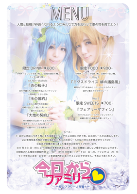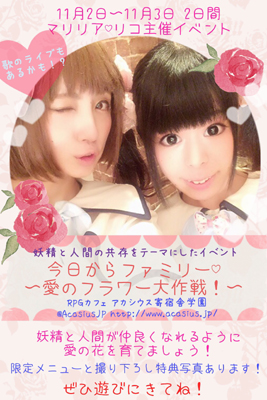 11月は学園祭と称し、 生徒が中心になってイベントを開催します。 すでに、部活のイベントが少しづつ発表されていますが、 部活のない日は、調理実習の日になります! 新入生が企画する楽しみや作る楽しさなどを 感じてもらえたらと思っています。 調理実習イベント 11月の部活イベントの合間にいくつかある調理実習イベント 普段は料理を作らない生徒達にも、何か料理を作ってもらいます。 どんなものが出来るか乞ご期待! 11月1日(日) 調理実習イベント 早番 アミリ、遅番イネス 11月2日(月)・3日(火 祝日) 今日からファミリーハート愛のフラワー大作戦! 皆様ごきげんよう! もうすぐ11月……生徒達がイベントを開催するお祭り月間がやってまいります! トップバッターはマリリアとリコが主催でお送りする 人間と妖精が仲良くなれるようにみんなで力を合わせて愛の花を育てよう! 『今日からファミリー♥〜愛のフラワー大作戦!〜』を開催いたします(*^^*) <日 程> 2015年11月2日(月)〜11月3日(火・祝) 計2日間 <概 要> 「愛の花」は人間と妖精が交流し 一緒に栄養を与え絆が深まらないと咲くことはありません。 見事!花が満開となり人間と妖精がファミリーとなれたときは 妖精たちがお祝いの歌をうたいます。 <ルール> @1回のご来訪につき1枚、または限定ドリンクをご注文につき1枚 お花のシールをお渡しします。 Aお客様全員共有の台紙に描かれた木に お花のシールを貼り木に花を咲かせてください。 Bお花が目標の数に達した場合のみ歌のライブを行います。 異種族の共存をテーマにした ハッピー☆フレンドリーなイベントになってますヽ(^ω^)ノ 限定フード・ドリンクはもちろん! 特典写真も人間と妖精をテーマに多種多様な内容でご用意しました!! お花が満開になりましたら、歌のライブを開催予定です。 満開にならないときはライブの開催はございません!!←(⚆ө⚆) !? <ドリンク> ALL600円・ノンアルコール お花のシール&ピンの写真(全6種、ランダム)付き ●炎の粒子 炎を守護にもつ妖精のお気に入りドリンク。人間味覚だと少し甘め。 ●水の盟約 とある人間が水の妖精に信頼の証として贈った青いドリンク。爽やかな味わい。 ●大地の契約 森の愛情を沢山受けて生まれた雫。人間界でいうところのお茶(ホット)。心穏やかになる効果あり。 愛の花を咲かせる為のお花のシールに加え、お写真もついてきますー! 写真は全6種類!妖精や人間の女の子、男の子たちのピンの写真がランダムで貰えます。 そして、なんと!!それだけではないのです!! ドリンクを期間中に3杯ご注文して下さった方には、リコ&マリリアのおっきい写真を差し上げます! どれくらい大きいかというと、とても大きいです!B5くらいある疑惑です!更に、サインも付けちゃう予感です!笑 衣装はいつもの制服ですが、2種類ご用意致しました。 ドリンク1杯目のご注文時にスタンプカードをお渡しするので、カードを持ってきて頂ければ翌日に引き継げるシステム。1日3杯ではなく、期間中3杯ですのでご無理なさらず、のんびり飲んでやんわり大きな写真もゲットしてもらえれば嬉しいです笑 <フード> ●11月2日提供 「妖精も人間も一緒に食べよう!ミクスドライス 緋の諸島風」 900円 妖精と人間の男の子たちの2ショット写真付き 一緒に食べれば笑顔になること間違いなし!お肉もお野菜も入ったしっかりとしたお食事。 ●11月3日提供 「フェアリーマフィン」 700円 妖精と人間の女の子たちの2ショット写真付き 人間の女の子のお手製マフィンを、妖精がいたずらでちょっとメルヘンにしちゃいました! それぞれ写真の種類は1種類ですが、とびきりの2ショットを選びました! 男の子と女の子、貰える日が違いますのでお気をつけ下さいね。 ※フードにはお花のシールは付きません。予めご了承ください ※お花のシールが貰えるのは、ご来訪時&ドリンクご注文時のみです。 写真、とってもとっても頑張ったので、是非手に取ってもらえると嬉しいです。 また、妖精と人間仲良くなれる気満々でお祝いの歌の練習も頑張ってます!が!お花が満開にならないとライブは開催出来ないので、何卒皆さまのご協力よろしくお願い致します!笑 みんなで楽しんで、愛の花を咲かせること出来ましたら幸いです