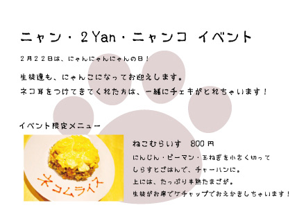 =============================== 2月1日(月)〜2月3日(水) 恵方巻っきまきイベント 七福海鮮恵方巻き 556円(税抜)をご用意。 福を巻き込む恵方巻き! 7種類の海鮮たっぷりな具材が入っています。 お寿司な感覚で一気に食べてくださいね! 2月4日(木)〜2月14日(日) ※2/8(月 休業日)を除く バレンタインチョコ&カードイベント(Choco & Card) イベント 一来店につき生徒の手作りカード1枚とチョコを貰えるイベント チョコレートとカード(ランダム)をお渡しいたします! この期間限定の特別カードです。 バリエーション豊かなバレンタインカード。 1来店に1枚のお渡しとなるので、 集めるのは大変そうですが、頑張ってくださいね。 チョコレートはクランチになって美味しくなってるので、 是非、ご来訪の際は、ご賞味いただけましたらと思います。 イベント限定ドリンク あわあわしょこら 400円 ※またこのイベント期間中、 今月のスイーツをご注文するとお好きなカードが付いてきます。 2月8日(月) 休業日 2月8日(月)は、休業(お休み)させて頂きます。 直前ではありますが、お知りおき、頂ければと思います。 2月15(月)〜2月22日(月) ニャン・2Yan・ニャンコ イベント 2月22日は、にゃんにゃんにゃんの日! 生徒たちもにゃんこになってお迎えしたいと思います。 ネコ耳をつけてきてくださると、一緒にチェキが撮れちゃいます!! 限定メニュー ねこむらいす800円 にんじん、ピーマン、玉ねぎを小さく切って、しらすとえびでチャーハンに。 バランスも良く、栄養満点! お席で生徒がケチャップでお絵描きをしてくれます。 今年も新しい耳を新調しました! 違いはわからないかもしれませんが、 お楽しみに!! 2月20日(土) 3月のカレンダー発売 今年のカレンダーは、2人ずつのデュアルな 恋愛シュミレーション仕様カレンダー 毎月、担当の生徒にお願いします。 2月21日(日) マイコバースディ 詳細は後日Blogにて 2月22日(月)〜2月29日(月) マイマグカップで召し上がれ 生徒達によるオリジナルマグカップを作成 詳細は後日Blogにて 焼き菓子の日: (毎週土曜、祝日) 毎週土曜日と祝日は、『焼き菓子の日』! 時間は未定(12時前後)なので、 学級日誌BLOGをチェックして、焼きたてを食べに来てくださいね。 アカシウス焼きたてベーカリーの日: (毎週日曜日) 焼き菓子の日だけでは飽きる…との事で始めた石鹸プレゼントでしたが やはりカフェなので、食べ物の方が良い・・・ との事で、日曜日は、『アカシウス焼きたてベーカリーの日』に 日曜日の朝に焼きたてのパンをご提供 有料ですが、とっても美味しいので、是非、召し上がってみてください。 それぞれのイベント毎の詳細は、こちらのWeb、もしくは学級日誌Blogで告知をしていきますので、ご期待ください。