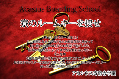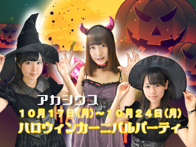 =============================== 10月1日(土)〜8日(土)※10/3休業日を除く 『寮のルームキーを捜せ』 この時期になるとお姉さまのお部屋係りも決まってきます。 お部屋係とは憧れのお姉さまのお部屋をお掃除する代わりに、 勉強をみてもらったり、長い秋の夜をお姉さまのお部屋で過ごしたり… そんな中 大切な寮の鍵が落ちているのを見つけてしまいました… お姉さまやシスターに怒られる前になんとか届けてあげたい…ところ… 拾った鍵をお部屋に届けてあげて! その日見つけてほしい鍵を見つけてくれた方にはスイーツチケットをプレゼント。 ※プレゼントと引き換えにキーカードを回収させていただきます またすべてのキーカードを揃える(全9枚)とアカシウスからお礼にお部屋の鍵のキーホルダー (生徒のサンクスカード付)をプレゼントいたします。 是非、ご協力してくださいね! キーカードお渡し条件 ・1来訪にキーカード1枚 ・生徒のオリカク741円(税抜)で2枚 ・別料金926円(税抜)ご利用毎に2枚 ・イベントドリンク各1枚 お姉さまが隠れて飲むアルコールドリンク 649円(税抜) お部屋係りが作るアールグレイのミルルティ 556円(税抜) ※全9種すべてランダムでのお渡し 土日限定(10月1日・2日)チャンス 10月1日は来訪時、 水色の鍵を1枚引いたら再度もう1枚のみ引く事が可能です。 10月2日は来訪時、 ピンク色の鍵を1枚引いたら再度もう1枚のみ引く事が可能です。 10月1日(土)〜 新メニュー追加 『ドラコヌール王国風 自家製カリーヴルスト』649円 竜騎士達の野外料理ドラコリアンで有名なドラコヌール王国 の食堂で好まれるのおつまみ 荒びきフランクに、トマトとワインで煮込まれた自家製のソースを ドバッとかけカレー粉を振り掛けた料理 ここまで本格的なカリーヴルストは、なかなか食べれませんので是非。 (現実世界でのドイツで)ビールのツマミと言えばこれという料理 10月3日(月) 休業日 10月3日(月) は、休業(お休み)させて頂きます。 10月9日(日)〜10月16日(日) アカシウス寄宿舎学園初めての体育祭 アカシウス史上初めての体育祭が始まります。 紅白チーム対抗体育祭です。 2チームに分かれて、闘います! 紅組には何がしたいのかわからない様子のおかしい生徒が… 白組は上級生が多いみたいだから、圧勝かな!? あなたはどちらのチームを応援する??? 詳細はこの後のブログで確認してね! 10月17日(月)〜10月31日(月) ハロウィンパーティ お菓子を持ってきてくれないと…イタズラされちゃいます。 1来訪につき、1枚の魔女写真をお渡しいたします。 限定メニューを注文すると写真2枚お渡し!是非、コンプしてみてください! そして!!!毎年恒例 Trick or Treat お菓子を持ってこないとイタズラしちゃいます! お菓子を生徒にくれないと、手にマジック(?)でイタズラ書きをしちゃいます! 忘れてしまったら、店内に回避アイテムもあるのでご利用ください。 ハロウィン限定メニュー Shadow Grave (シャドウグレイブ) (10月17日〜10月31日まで) 月明かりも無い漆黒の新月の夜、呪われた墓所の最も暗き影を、ヘルスパイダーの糸で 絡める集め、その忌まわしき暗き影を薬草と共にケルベロスの業火で煮詰めたもの。 悪しき存在を召還する為、虚ろな精神状態になりたい時に魔女が飲むと言われている。 Eyeball of Cockatrice (アイボール オブ コカトリス) (10月17日〜10月31日まで) 吐息を浴びた物を石と化すコカトリス。 そのコカトリスの目玉を輪切りにし、禁じられた薬草と共にゼリー状になるまで煮詰めたもの。 地獄の饗宴が始まる前、精力増進に魔女が飲むとされている。 オランジェ・ハロウィン アルコール弱 500円 熟したオレンジ果汁を果実酒で割ったさっぱりしたドリンク。これを飲むともっとハロウィンが楽しくなる! ハロウィンくじ (10月17日〜10月31日まで) 毎年恒例のハロウィンクジ! お菓子を持ってくるのを忘れた、でもイタズラはされたくないという方の救済アイテムです。 それぞれ生徒のカードが入ってますので、お楽しみに!!! ごくまれに ラッキーなチェキ券も入っています!! 10月17日(月)〜10月24日(月) ハロウィン第1弾 カーニバルパーティ 10月17日(月)〜10月24日(月) 魔女と悪魔に生徒たちは扮してハロウィンを盛り上げます。 Trick or Treat お菓子を生徒にくれないと、イタズラしちゃいます!。 忘れてしまったら、店内に回避アイテムもあるのでご利用ください。 ハロウィン限定メニュー チェキ付(お好きな生徒と撮影可能です) Shadow Grave (シャドウグレイブ)741円(税抜) 月明かりも無い漆黒の新月の夜、呪われた墓所の最も暗き影を、ヘルスパイダーの糸で 絡める集め、その忌まわしき暗き影を薬草と共にケルベロスの業火で煮詰めたもの。 悪しき存在を召還する為、虚ろな精神状態になりたい時に魔女が飲むと言われている。 Eyeball of Cockatrice (アイボール オブ コカトリス)741円(税抜) 吐息を浴びた物を石と化すコカトリス。 そのコカトリスの目玉を輪切りにし、禁じられた薬草と共にゼリー状になるまで煮詰めたもの。 地獄の饗宴が始