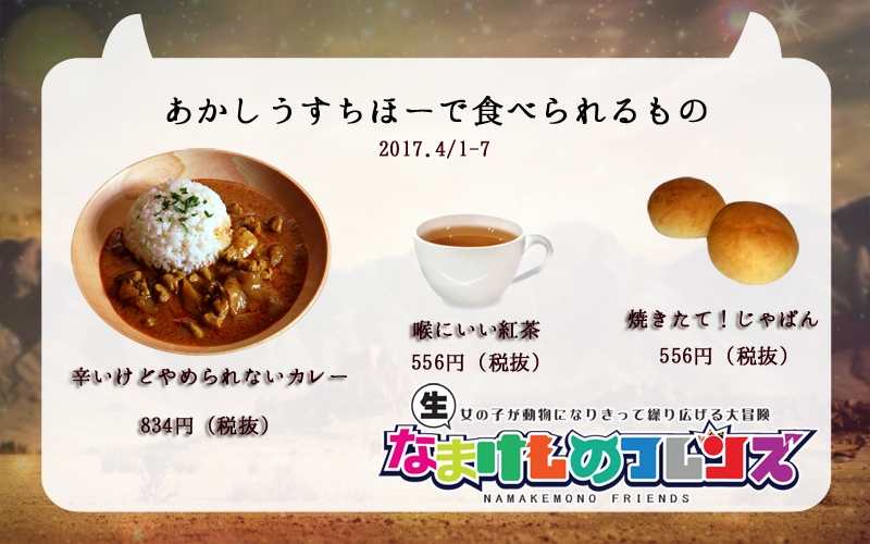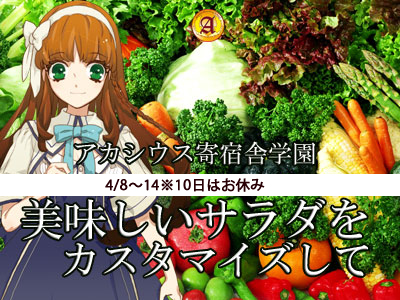 =============================== 4月1日(土)〜4月7日(金) エイプリールフール記念 なまけものフレンズイベント開催 池袋にあるアカシウス寄宿舎学園カフェテリアにて 『生けものイベント』イベントを開催いたします。 期間中キャストたちはいろんなフレンズに イベントフードなど エイプリールフール2017だったHPの内容はこちら(リンク) 図鑑などが見れます。 4月8日(土)〜4月14日(金) ※4/10日はお休み 美味しいサラダをカスタマイズ 春野菜が美味しい季節です。 温かくもなって、すこし体調を整えたい時期。 そろそろ冷たいサラダでも美味しい季節です。 一風変わったサラダに、カスマイズ注文をして チョイスしたドレッシングを生徒に掛けて貰えるイベント 国産野菜にこだわった体にいい野菜を美味しく楽しく摂って健康に! 4月8日は幼葉の日ということで春の葉っぱが美味しい季節。 手作りのドレッシングで美味しさをこだわり野菜の美味しさを 味わってもらえたらと思います。 スタンダード741円(税抜) レタス・サニーレタス・ベビーリーフ・鶏肉 トッピングを3種類選んでね! クラッシュドトルティーヤ フライドガーリック パクチー コーン スライスキュウリ スライスニンジン スライス玉ねぎ パプリカ カリカリベーコン 追加トッピングはひとつにつき+93円(税抜) 全部のせは1112円(税抜)となります。 ドレッシング シーザー コブ 緋の諸島(お醤油ベースのオリジナル) 日替わり(キッチンスタッフによる手作りドレッシング) お席でドレッシングをおかけいたします。 4月10日(月) 休業日 4月15(土)〜4月22日(土) お得なチェキキャンペーン 詳細は後日Blogにて 4月20日(木) 5月のカレンダー発売 今年のカレンダーは、色(Color)がテーマ。 担当キャストがプロデューサーになり、人数も衣装も、構成も! 自由に表現してもらおうと思っています。 各自の好きな色でどんな風になるのか楽しみです。 2〜12月すべてのカレンダーを集めると アカシウスの1年間を盛り込んだ特典ROMをお渡しいたしますので 是非集めてみてくださいね! 4月23日(日) ミィナ卒業式 詳細は後日Blogにて