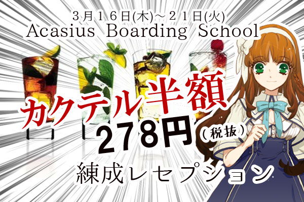 =============================== 3月1日(水)〜3月3日(金) 最後の姫祭り 先日発表させて頂きました最後の姫部イベント姫祭り!! 3月1、2、3日開催です!! 今日は今までの感謝を込めて、姫部からちょっとしたパーティーゲームイベントを開催させて頂くお知らせをさせて頂きます(*´艸`*)♪ ゲームの内容は… \\\姫部の豪華景品が当たる!!//// 『ビンゴ大会』です!! ・1来訪につき1枚ビンゴカード用紙をお渡し致します♪←勿論初日からお渡ししますょー! ・3日目の20時からビンゴ大会を開催させて頂きます! その時間にご来訪して頂いた方で、ビンゴ大会をさせて頂きます♪ 当たる景品は、この姫祭り中に飾ってありますので当日までのお楽しみv(`ゝω・´)☆ びっくりするような景品もありますので是非楽しみにしてて下さいね(*´艸`*)♪ ご来訪して頂ければ誰でも参加権利がありますので、皆様最後の大盤振る舞い振るってご参加下さい♪ 【イベントフード】 3/1 コンソメスープ+バケット付き ¥900 3/2 豆乳味噌スープ+わかめご飯付き ¥900 3/3 華麗に散るカレー!!!🍛 ¥900 【イベントスイーツ】 3/1 パンナコッタ ¥700 3/2 抹茶プリン ¥700 3/3 最終日はカレーを華麗にお代わりでしょ?💓 ¥900 【イベントドリンク】 全日共通ノンアルコールドリンク各¥600 夜空のフロートソーダ(ice) フルーツ!ティーパンチ!(ice) ほかほかローズラテ(hot) 全日共通アルコールドリンク¥700 大人の抹茶ミルル もちろん!いずれのメニューもご注文頂くと特典写真が付いてきます🎵 そして特典写真全15種類をコンプリートして頂いた方には! \\姫部の想い出が詰まったロムをプレゼント!//// 過去のイベントで配布してない秘蔵のお写真沢山詰まった大変豪華なROMです!! 最後なので大盤振る舞いです 3月4日(土)〜3月14日(火) (※3/13除く) C&C (チョコ & カード) ホワイト イベント 1来店につき1枚キャストの手作りオリジナルカード とホワイトチョコを1つお渡しです!! バレンタインデーの時と同じくこの期間限定の特別カードです。 今回も、みんなには寮に帰ってからの 宿題としてがんばってもらっていました。 3月4日(土)〜3月6日(月) 3日間だけのオリジナル・ラミカカードプレゼント チョコは手作りです!! ホワイトチョコですが、クランチタイプで食べやすいと思います。 キャストの手作りオリジナルカードですが ●1来店につき1枚ランダムのお渡し ●Valentineのお返しを頂いた方へも追加で1枚ランダムでお渡し ●限定ドリンクを注文した方へ、希望カードをお渡しします。 イベント限定ドリンク ホワイトキャラメリーぜ 3月13日(月) 10周年100日前 3月15日(水) ノラ卒業式 詳細は後日Blogにて 3月16日(木)〜3月21日(火) あなたのオリカク作ります! カクテル半額!練成レセプション 飲み放題メニュー 追加 詳細は後日Blogにて 3月20日(月 祝) 3月のカレンダー発売 今年のカレンダーは、色(Color)がテーマ。 担当キャストがプロデューサーになり、人数も衣装も、構成も! 自由に表現してもらおうと思っています。 各自の好きな色でどんな風になるのか楽しみです。 2〜12月すべてのカレンダーを集めると アカシウスの1年間を盛り込んだ特典ROMをお渡しいたしますので 是非集めてみてくださいね! 3月22日〜31日 (※3/23、3/25除く) シェア得コンペ 写真をシェアしてお得な特典をゲットしちゃおうなイベント。 詳細は後日Blogにて 3月23日(木) リリィ卒業式 詳細は後日Blogにて 3月25日(土) カトラ・サクナ卒業式 詳細は後日Blogにて