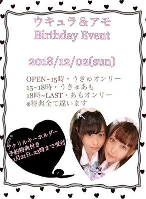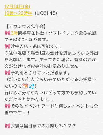 12月29日(土) 11:00−22:30 12月30日(日) 11:00−22:30 12月31日(月) 16:00−24:10 最終日 =============================== 12月のシステム変更点 ●初めてご来訪のお客様特典の一部中止 初めてご来訪のお客様特典を先月までと違い クリアファイルのみにさせて頂きます。 ★アカシウス寄宿舎学園特製クリアファイル ●竜騎士達の狩猟場バーグ(ハンターバーグ) 価格改訂 463円(税抜) −> 556円(税抜) ●パスタ麺ソースの一部廃止 麺:ファルファッレ(Farfalle)の廃止 ソース:イゾラマーレの廃止 =============================== Acasius Royalist メンバー特典 6月にカードを配らせて頂いた(2018/7〜12と記載の) Acasius Royalist メンバーの方々への今月の特典をご案内致します。 12月中の特典 毎週水曜日:チェキポイントでデカチェキが撮影可能。 <ただし誕生日・卒業式の日を除く> 毎週木曜日:チェキ半額ポイント 男性上級職でなくてもオムライスご注文可能 毎週金曜日:カクテル半額 毎週日曜日:チェキ半額ポイント<ただし誕生日・卒業式の日を除く> ご注文ご依頼時に、Acasius Royalist Cardを提示してください。 どの特典も1来訪につき1回までのサービスとなります。 =============================== 月間イベントスケジュール 卒業生復活最後のお手伝い日 12/3(月) 12/8(土) 12/9(日) 12/15(土) 12/16(日) 12/21(金) 12/22(土) 12/23(日) 12/24(月) 最後のお別れに、元生徒の卒業生達が 上記の日程、お手伝いしてくれます。 ※随時追加変更の可能性あり。詳細は当日Blogにて 12月2日(日) ウキュラ・アモ バースディ イベント 今年も、12月2日(日)に 💙ウキュラ&アモ💜 合同バースデーイベントを行います!✨ 今回は、なんと! 『アクリルキーホルダー』を 販売させていただきます♡ 初のうきゅあもBDグッズです! こちらは事前予約受付を本日から行います! アクリルキーホルダーは 2種・各800円 予約の特典がございます! 💙グッズ予約特典 ★バラでの予約特典 (2種どちらを選んでも一緒です) 1個につき、 ・写真1枚(ツーショットメイド衣装) ★2個セット(各1種)の予約特典 1セットにつき、 ・写真1枚(ツーショットメイド衣装) ・チェキ(ツーショットメイド衣装orツーショット制服) ※2セットご予約いただいた方は1枚ずつの配慮します。 ※セットの写真はバラ特典と同じものです。 ※ツーショット写真は当日配布はございません! ツーショット写真が手に入るのは予約特典のみです…! 当日分は少数ご用意する予定ですが、 特典は付きませんのでご注意ください…! 💙 バースデーイベントの特別メニューや 特典などの内容詳細は、 後日お知らせ致しますので、お待ちくださいね✨ 12月7日(金) アリア バースディ イベント ごきげんぱっぴー☆ 12月はお誕生日のキャストが多いですがそんな私も12月生まれです(笑) 今年は12/7(金)にイベントを開催します☆ コンセプトは【みんなにお祝いしてもらうBD!!】 今回、OG復活給仕等ありますが会えていないOGもいっぱいいるので是非この機会に会いに来てもらえたら嬉しいです💕 勿論現役キャストも愉快なお祝い企画を考えてくれています!!(笑) 私が幸せになる企画をみんなが手伝ってくれるので良かったら生暖かい目で見に来てやって下さい(笑) 12月12日(水) 元紋章官の晩餐 12日(水)は、紋章官をしていた頃を思い出し、ワインの利いたお料理をご提供します。 クリスマスを除けば、もう最後の手作り料理になると思うので 機会がありましたら是非。 12日限定メニュー ★チーズフォンデュバーグと野菜が美味しい赤ワインシチュー 単品 741円(税抜) ご飯付き 926円(税抜) 白ワインが効いた少し苦みのあるチーズフォンデュをたっぷり掛けたハンバーグ と、香味野菜を美味しく煮込んだ赤ワインシチュー。 どちらもワインが効いている少し大人の味のプレートです。 12月12日なので限定12食。 ★フードご注文特典 Unstable Plot(未定着な設定)本(14ページ) プレートを含め、何かフードメニューを頼んで頂いた方に Unstable Plot(未定着な設定)資料をプレゼント! コピー本に近く、大した内容は書かれてませんが 過去のクエストやイベントに登場した数々の設定を 簡単にまとめた設定資料です。 これも最後の記念に是非、手に入れてみて頂けたらと思います 12月14日(金) アカシウス忘年会イベント 12月14日(金)19時からアカシウス忘年会イベント開催します! 店頭で予約を承っておりますのでご都合合う方は是非ご予約お待ちしております✨また現在店内にある椅子数が定員となりますので予めご了承ください🙇 イベント内容的には乾杯ドリンクなどご用意する予定ですので 一緒に飲んだり思い出語ったりワイワイして 最後に楽しい思い出を作りましょうって感じです! 12月17日(月)〜21日(金) ハンドベル演奏 まずはアカシウス寄宿舎学園の 店内でハンドベル演奏を行います。 12月20日(土)〜12月25日(月) 萌ゆるレッド サンタガール やっぱりクリスマスはサンタガールを見たい。 最後だけど、クリスマスを盛り上がりたい! 詳細は後日Blogにて 12月31日(月) Final farewell Countdown カウントダウンでごきげんよう 
