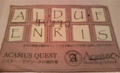 いろんな場所に隠れた、シスターのお見合い相手の文字を集めて、コランダムの生徒を通じてシスター・マドリーヌへ名前を教えてあげてください。