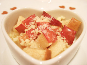 お皿にハート型に盛り付けたシナモンをお好みでスプーンに付けながら