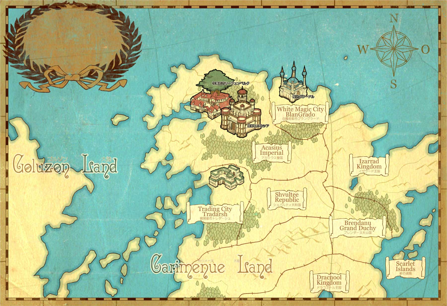 大陸内には、皇国に忠誠を誓う、白魔術都市ブラングラード、シュバルティ共和国、ブレンダーヌ大公国、貿易都市トレダーシュ、イザラード王国などがある。