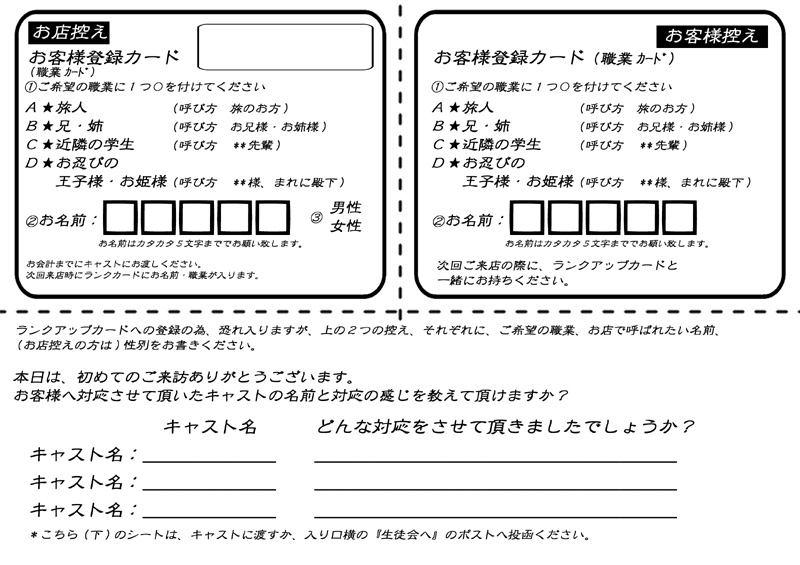 必要事項をご記入の上、お会計の際にキャストにお渡しください。