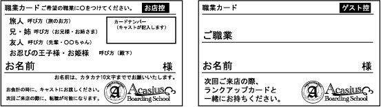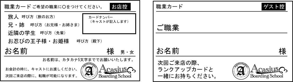 アカシウス寄宿舎学園へお越しの際は、ランクカードとは別に、滞在許可証が発行されます。滞在許可証には、各職業のマークが入っておりますので、生徒(キャスト)に見えるようにお願い致します。